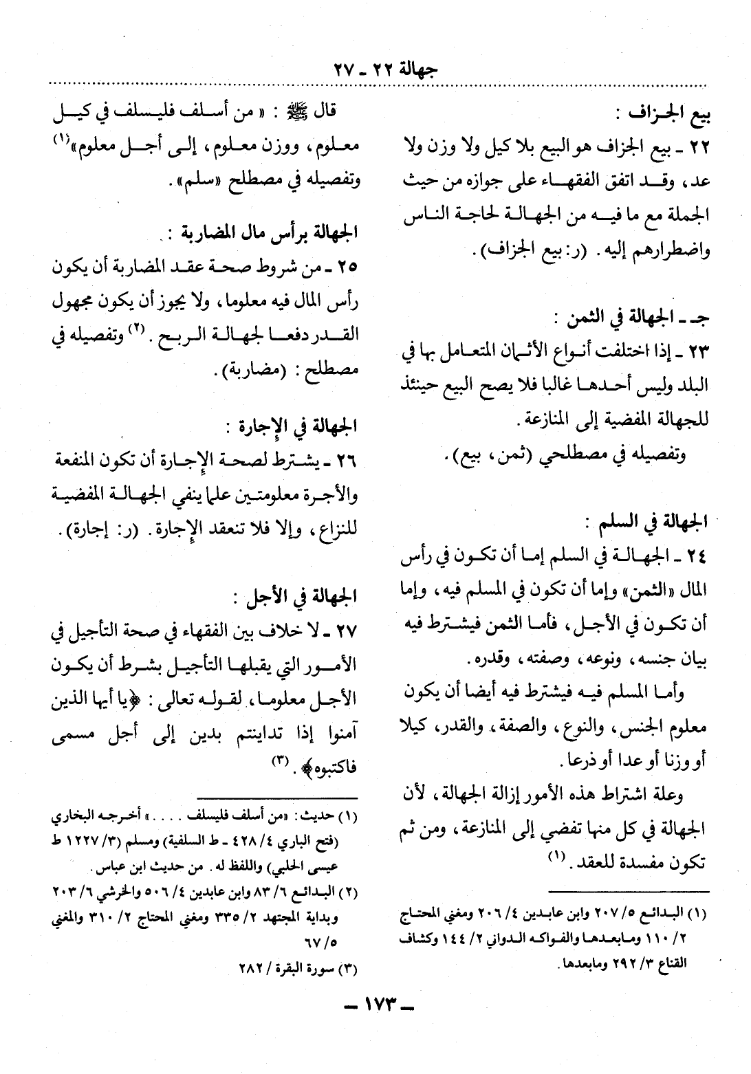 24 - الْجَهَالَةُ فِي السَّلَمِ إِمَّا أَنْ تَكُونَ فِي رَأْسِ الْمَال " الثَّمَنِ " وَإِمَّا أَنْ تَكُونَ فِي الْمُسَلَّمِ فِيهِ، وَإِمَّا أَنْ تَكُونَ فِي الأَْجَل، فَأَمَّا الثَّمَنُ فَيُشْتَرَطُ فِيهِ بَيَانُ جِنْسِهِ، وَنَوْعِهِ، وَصِفَتِهِ، وَقَدْرِهِ.