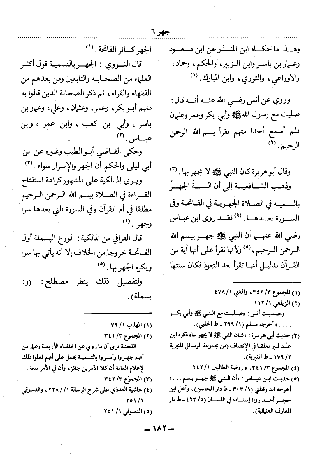 (2) المجموع 3 / 341. اللجنة ترى أن ما روي عن الخلفاء الأربعة وعمار من أنهم جهروا وأسروا بالتسمية يحمل على أنهم فعلوا ذلك لإعلام العامة أن كلا الأمرين جائز، وأن في الأمر سعة.