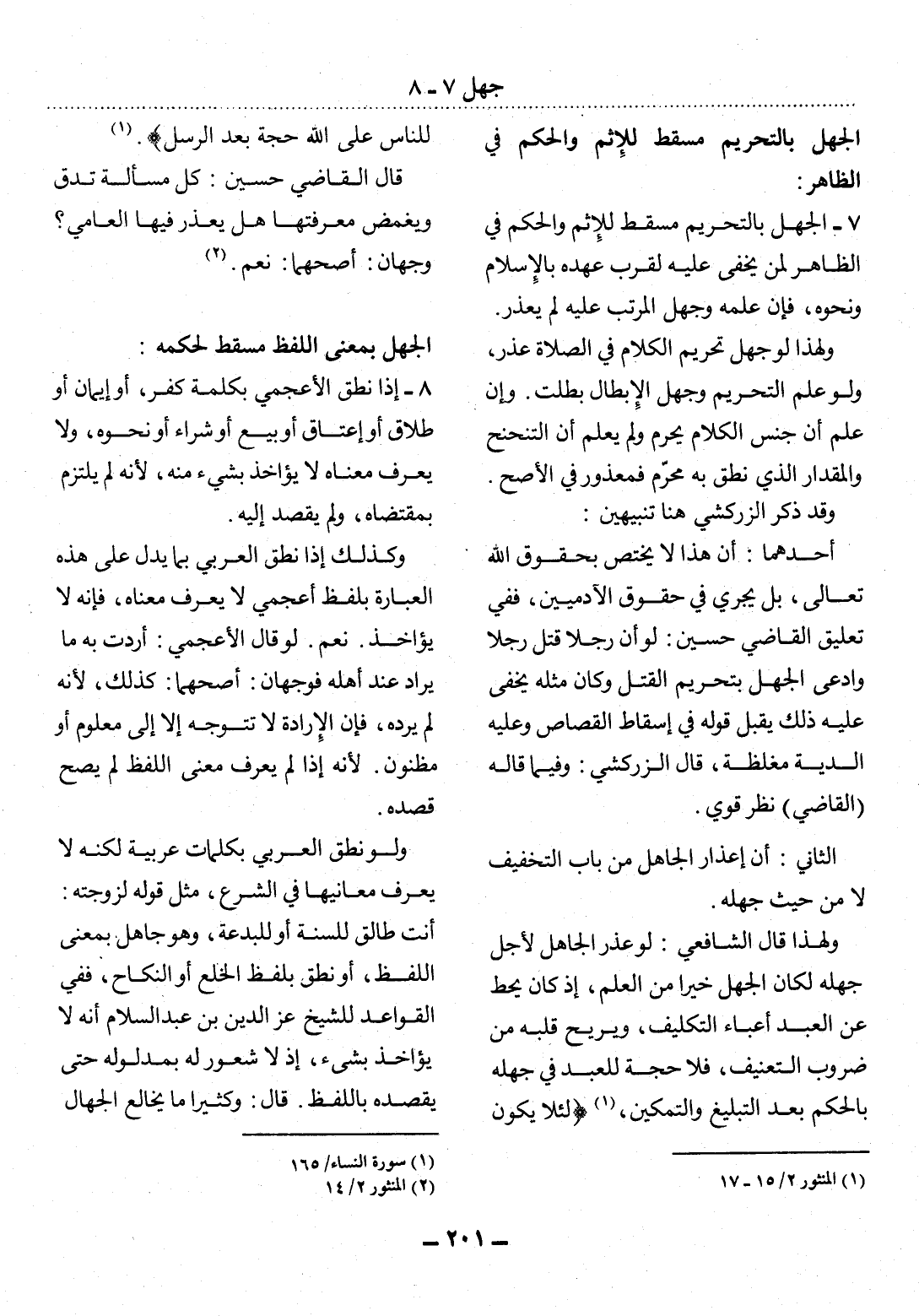 7 - الْجَهْل بِالتَّحْرِيمِ مُسْقِطٌ لِلإِْثْمِ وَالْحُكْمِ فِي الظَّاهِرِ لِمَنْ يَخْفَى عَلَيْهِ لِقُرْبِ عَهْدِهِ بِالإِْسْلاَمِ وَنَحْوِهِ، فَإِنْ عَلِمَهُ وَجَهِل الْمُرَتَّبَ عَلَيْهِ لَمْ يُعْذَرْ.