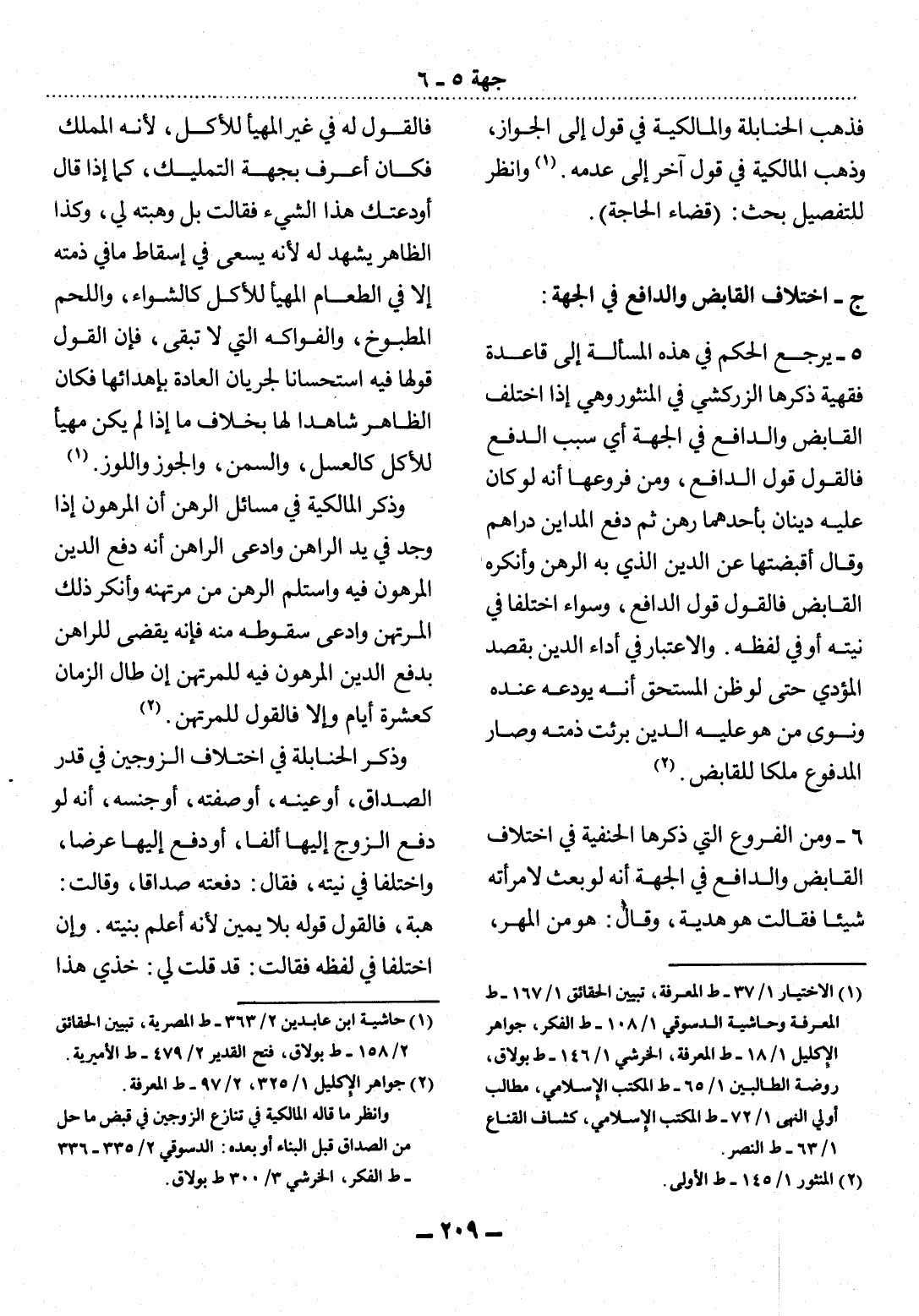 (2) جواهر الإكليل 1 / 325، 2 / 97 - ط المعرفة. وانظر ما قاله المالكية في تنازع الزوجين في قبض ما حل من الصداق قبل البناء أو بعده: الدسوقي 2 / 335 - 336 - ط الفكر، الخرشي 3 / 300 ط بولاق.