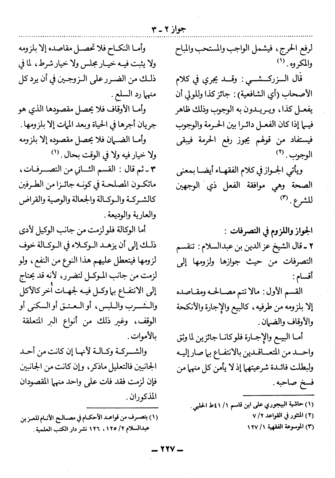 2 - قَال الشَّيْخُ عِزُّ الدِّينِ بْنُ عَبْدِ السَّلاَمِ: تَنْقَسِمُ التَّصَرُّفَاتُ مِنْ حَيْثُ جَوَازُهَا وَلُزُومُهَا إِلَى أَقْسَامٍ:
