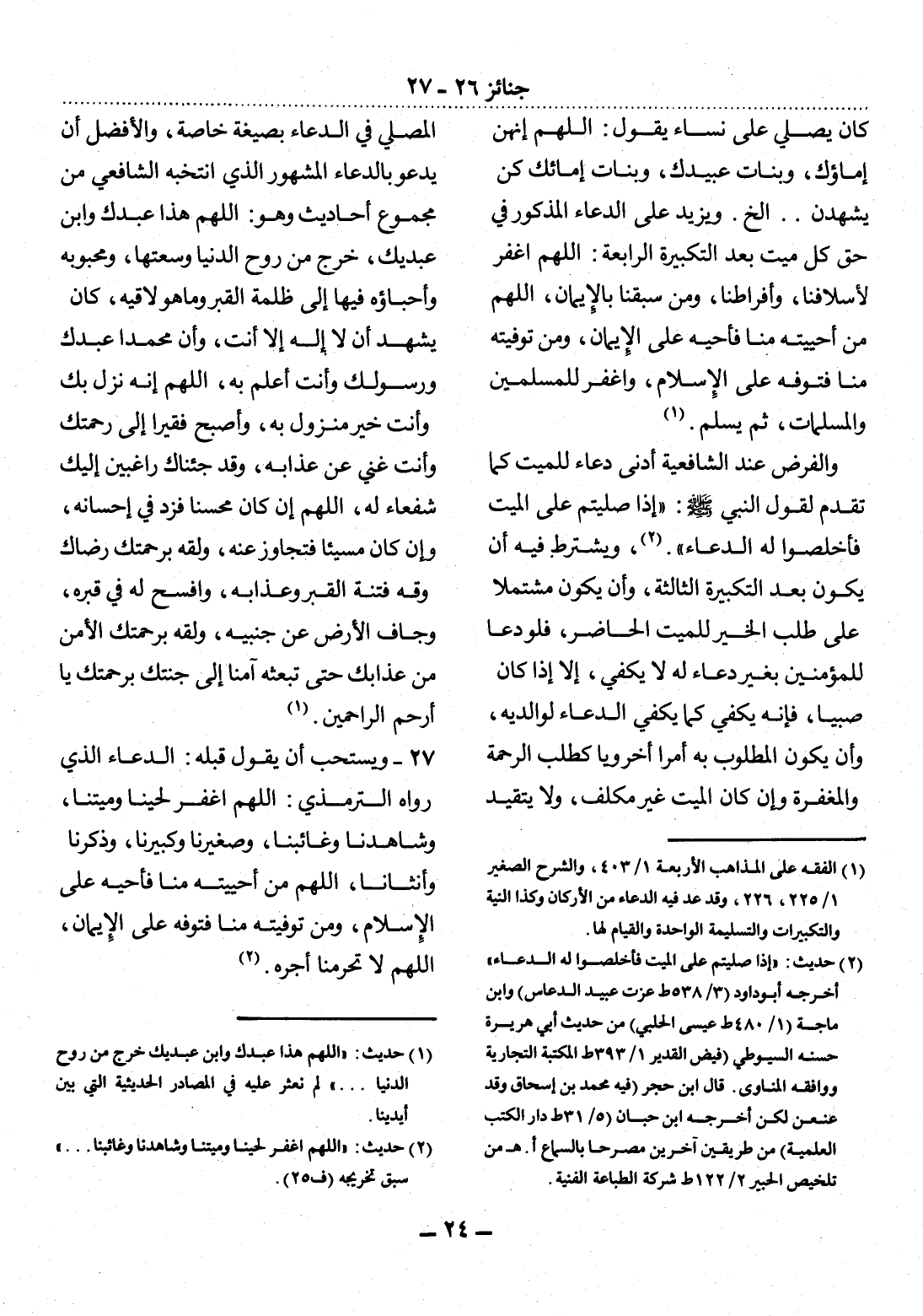 (2) حديث: " إذا صليتم على الميت فأخلصوا له الدعاء " أخرجه أبو داود (3 / 538 ط عزت عبيد الدعاس) وابن ماجه (1 / 480 ط عيسى الحلبي) من حديث أبي هريرة حسنه السيوطي (فيض القدير 1 / 393 ط المكتبة التجارية) ووافقه المناوي. قال ابن حجر: فيه محمد بن إسحاق وقد عنعن لكن أخرجه ابن حبان (5 / 31 ط دار الكتب العلمية) من طريقين آخرين مصرحا بالسماع أ. هـ من تلخيص الحبير 2 / 122 ط شركة الطباعة الفنية.