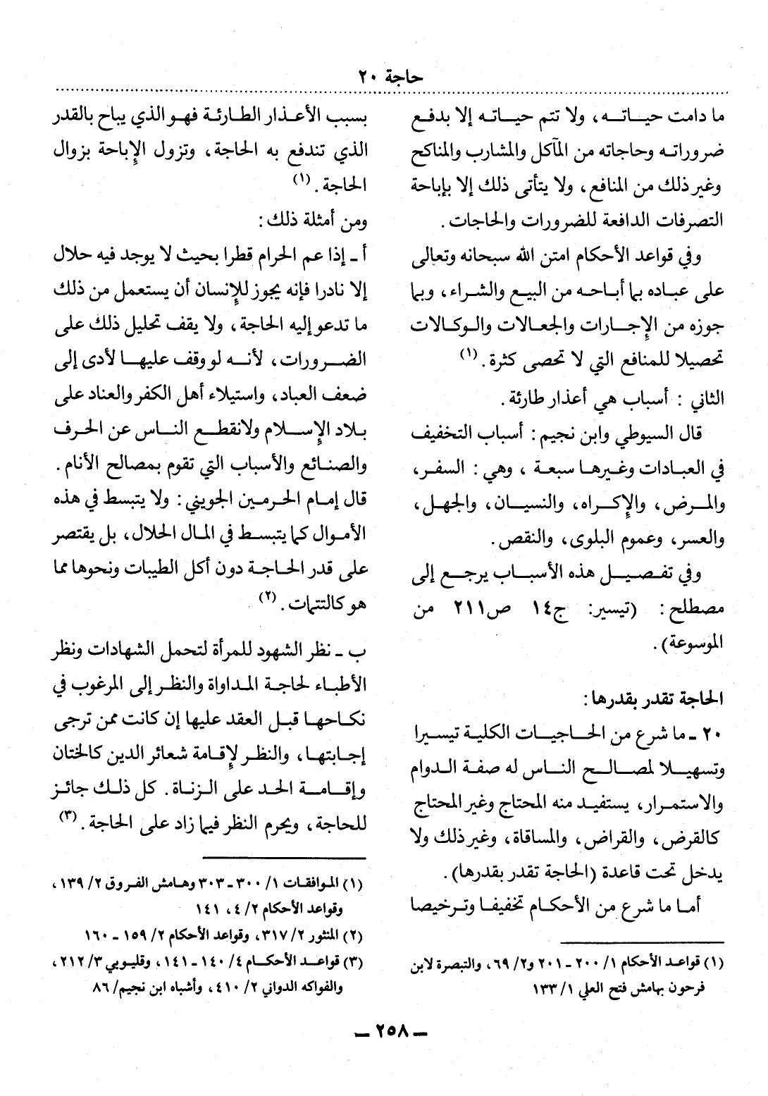 20 - مَا شُرِعَ مِنَ الْحَاجِيَّاتِ الْكُلِّيَّةِ تَيْسِيرًا وَتَسْهِيلاً لِمَصَالِحِ النَّاسِ لَهُ صِفَةُ الدَّوَامِ وَالاِسْتِمْرَارِ، يَسْتَفِيدُ مِنْهُ الْمُحْتَاجُ وَغَيْرُ الْمُحْتَاجِ كَالْقَرْضِ، وَالْقِرَاضِ، وَالْمُسَاقَاةِ، وَغَيْرِ ذَلِكَ، وَلاَ يَدْخُل تَحْتَ قَاعِدَةِ (الْحَاجَةُ تُقَدَّرُ بِقَدْرِهَا) .