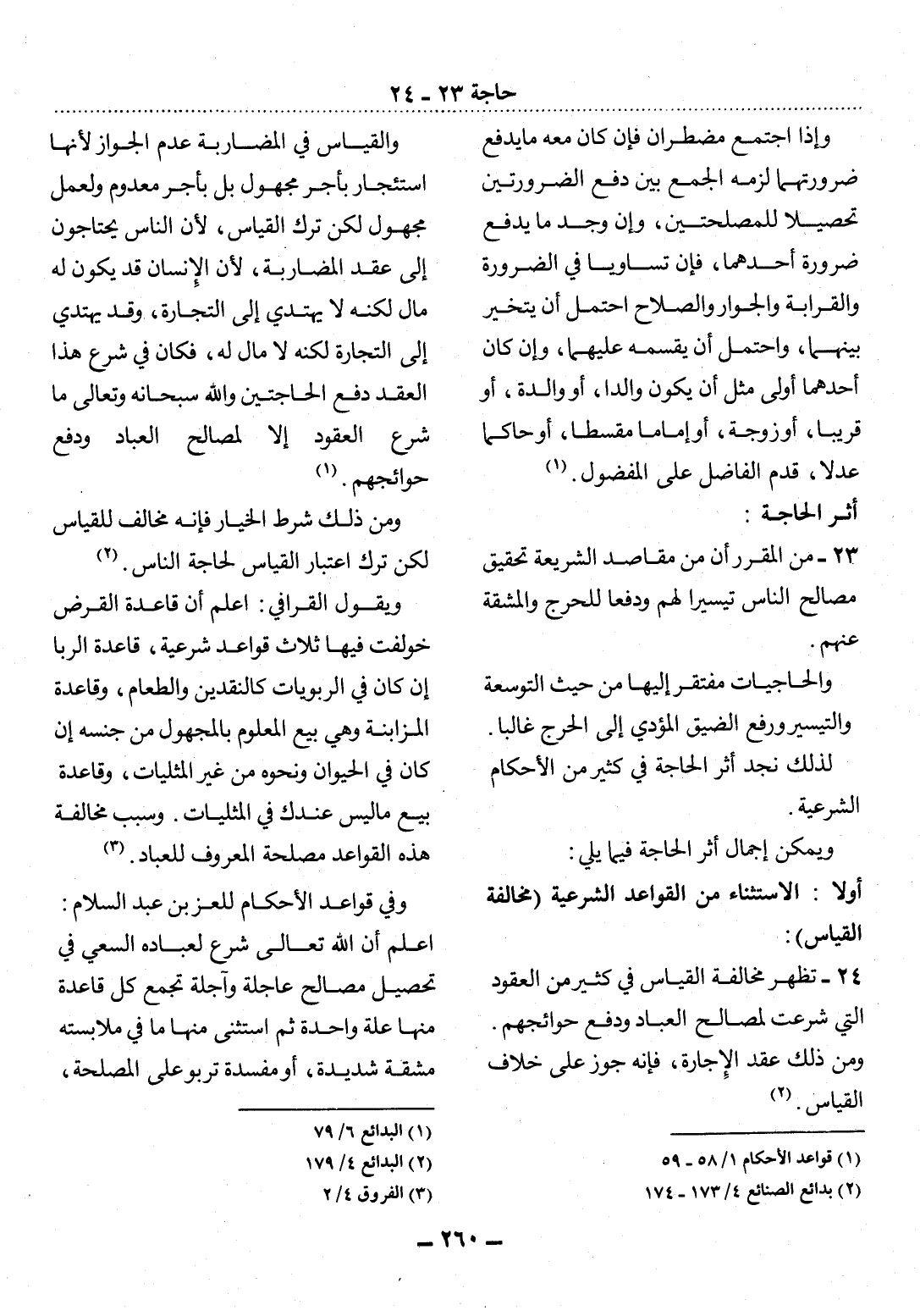 23 - مِنَ الْمُقَرَّرِ أَنَّ مِنْ مَقَاصِدِ الشَّرِيعَةِ تَحْقِيقَ مَصَالِحِ النَّاسِ تَيْسِيرًا لَهُمْ وَدَفْعًا لِلْحَرَجِ وَالْمَشَقَّةِ عَنْهُمْ. وَالْحَاجِيَّاتُ مُفْتَقَرٌ إِلَيْهَا مِنْ حَيْثُ التَّوْسِعَةُ وَالتَّيْسِيرُ وَرَفْعُ الضِّيقِ الْمُؤَدِّي إِلَى الْحَرَجِ غَالِبًا. لِذَلِكَ نَجِدُ أَثَرَ الْحَاجَةِ فِي كَثِيرٍ مِنَ الأَْحْكَامِ الشَّرْعِيَّةِ.