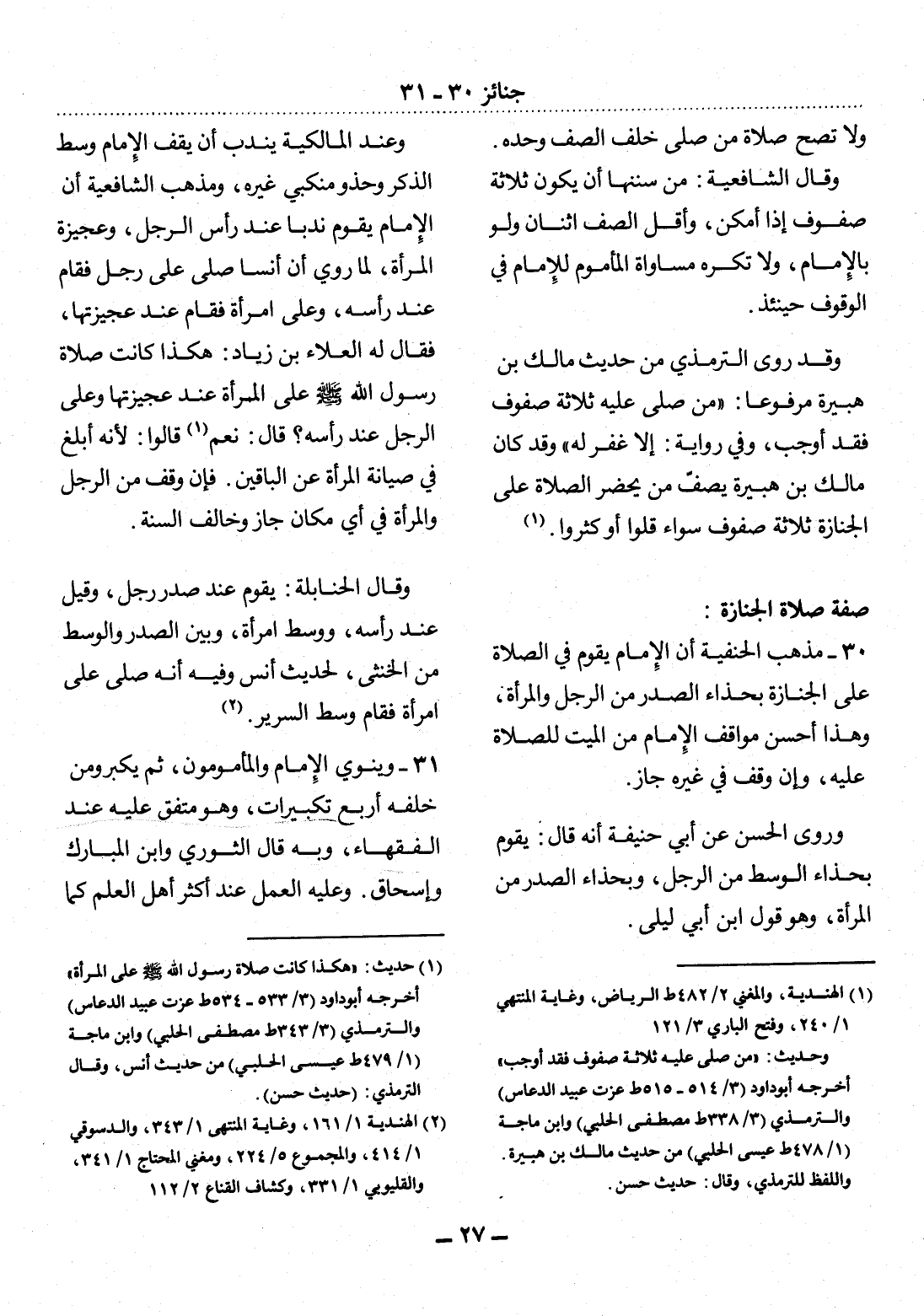 (1) الهندية، والمغني 2 / 482 ط الرياض، وغاية المنتهى 1 / 240، وفتح الباري 3 / 121. وحديث: " من صلى عليه ثلاثة صفوف فقد أوجب " أخرجه أبو داود (3 / 514 - 515 ط عزت عبيد الدعاس) والترمذي (3 / 338 ط مصطفى الحلبي) وابن ماجه (1 / 478 ط عيسى الحلبي) من حديث مالك بن هبيرة. واللفظ للترمذي، وقال: حديث حسن.