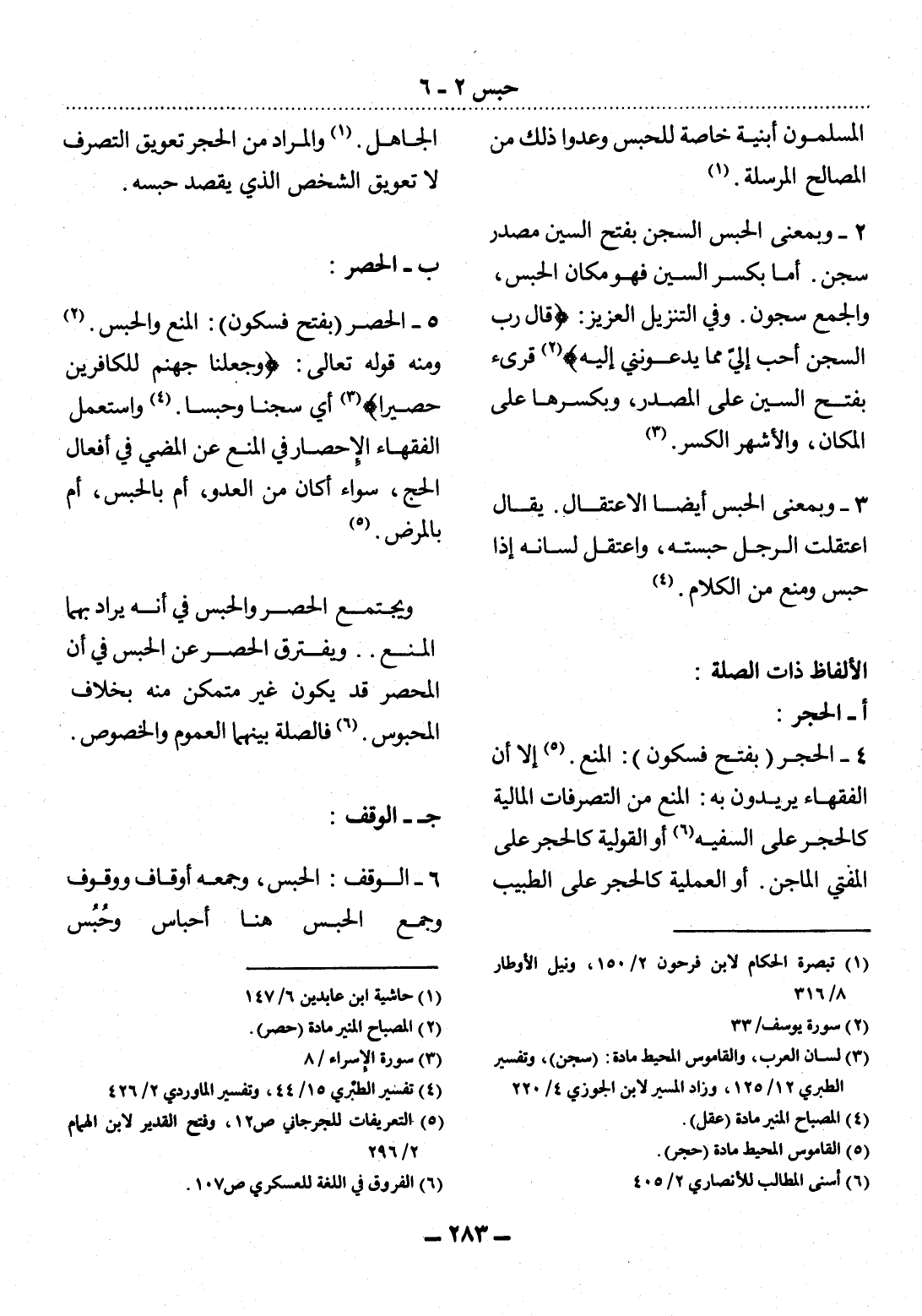 6 - الْوَقْفُ: الْحَبْسُ، وَجَمْعُهُ أَوْقَافٌ وَوُقُوفٌ وَجَمْعُ الْحَبْسِ هُنَا أَحْبَاسٌ وَحُبُسٌ