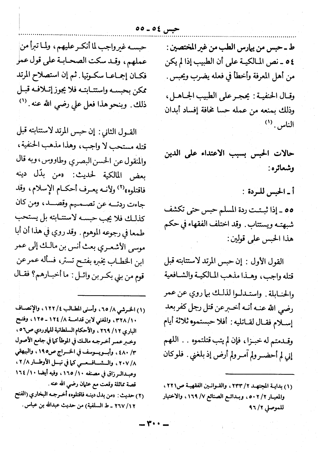 55 - إِذَا ثَبَتَتْ رِدَّةُ الْمُسْلِمِ حُبِسَ حَتَّى تُكْشَفَ شُبْهَتُهُ وَيُسْتَتَابَ. وَقَدِ اخْتَلَفَ الْفُقَهَاءُ فِي حُكْمِ هَذَا الْحَبْسِ عَلَى قَوْلَيْنِ: