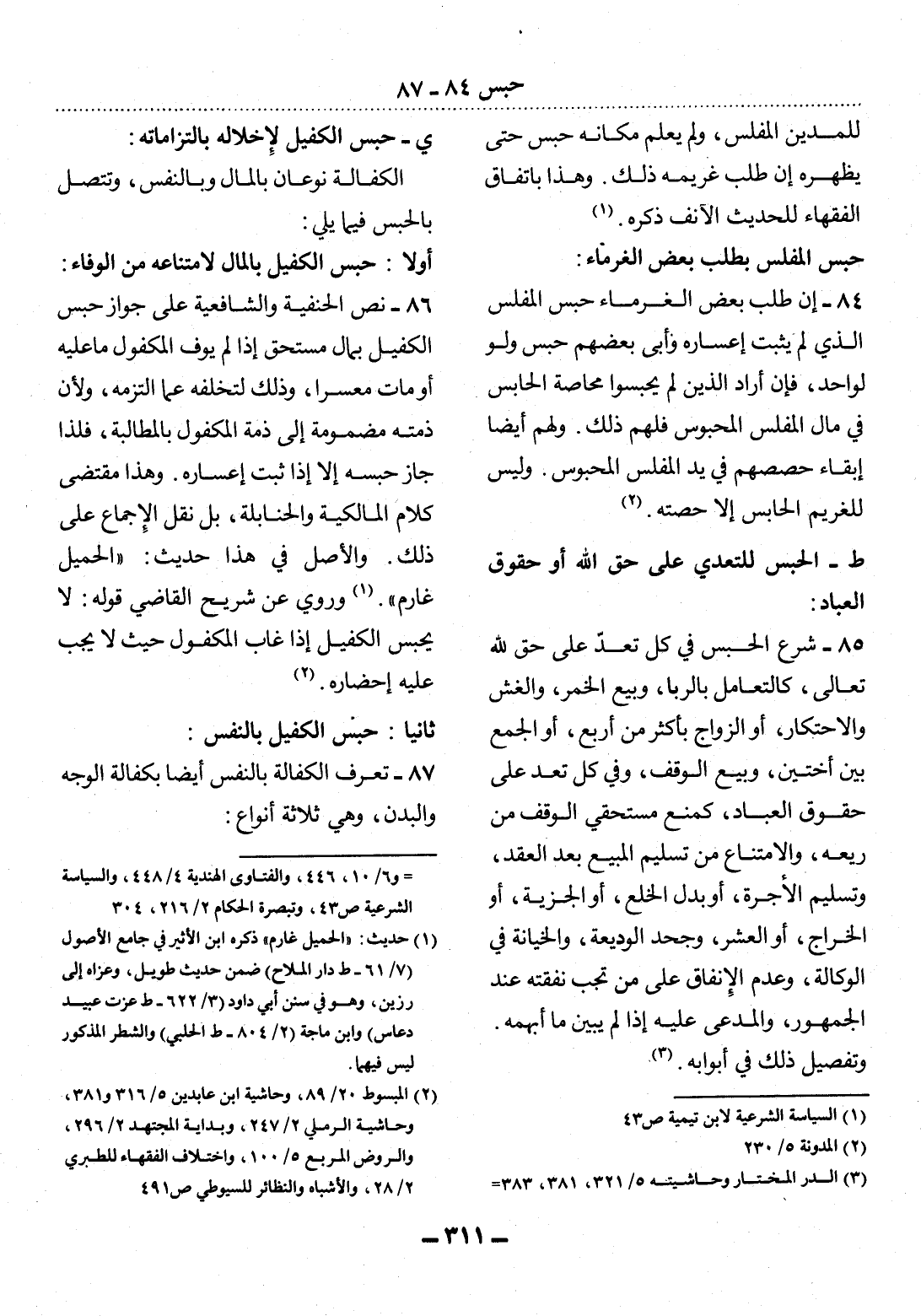 87 - تُعْرَفُ الْكَفَالَةُ بِالنَّفْسِ أَيْضًا بِكَفَالَةِ الْوَجْهِ وَالْبَدَنِ، وَهِيَ ثَلاَثَةُ أَنْوَاعٍ: