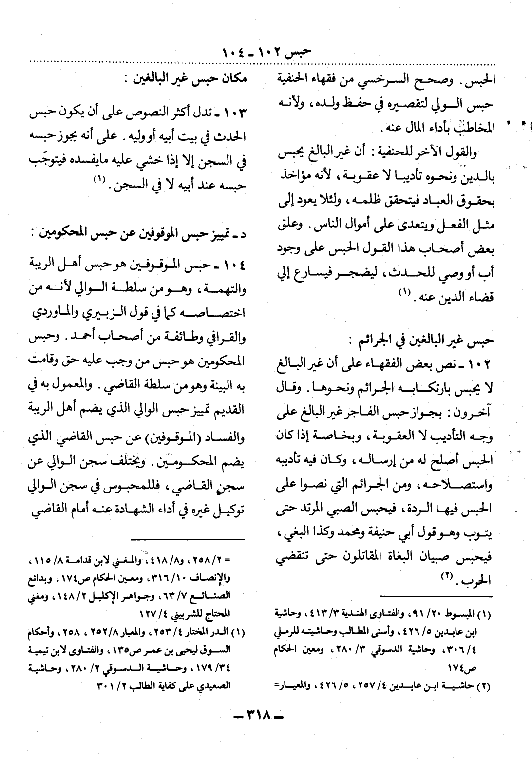 103 - تَدُل أَكْثَرُ النُّصُوصِ عَلَى أَنْ يَكُونَ حَبْسُ الْحَدَثِ فِي بَيْتِ أَبِيهِ أَوْ وَلِيِّهِ. عَلَى أَنَّهُ يَجُوزُ حَبْسُهُ فِي السِّجْنِ إِلاَّ إِذَا خَشِيَ عَلَيْهِ مَا يُفْسِدُهُ فَيَتَوَجَّبُ حَبْسُهُ عِنْدَ أَبِيهِ لاَ فِي السِّجْنِ (1) .