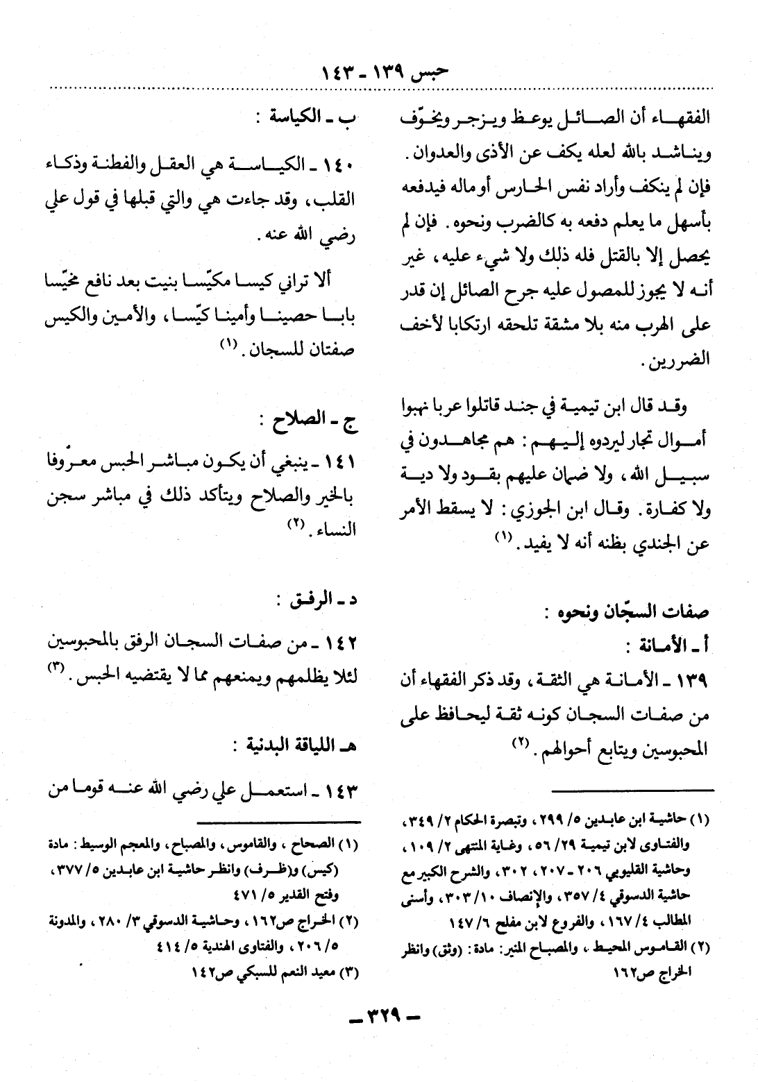 142 - مِنْ صِفَاتِ السَّجَّانِ الرِّفْقُ بِالْمَحْبُوسِينَ لِئَلاَّ يَظْلِمَهُمْ وَيَمْنَعَهُمْ مِمَّا لاَ يَقْتَضِيهِ الْحَبْسُ. (3)