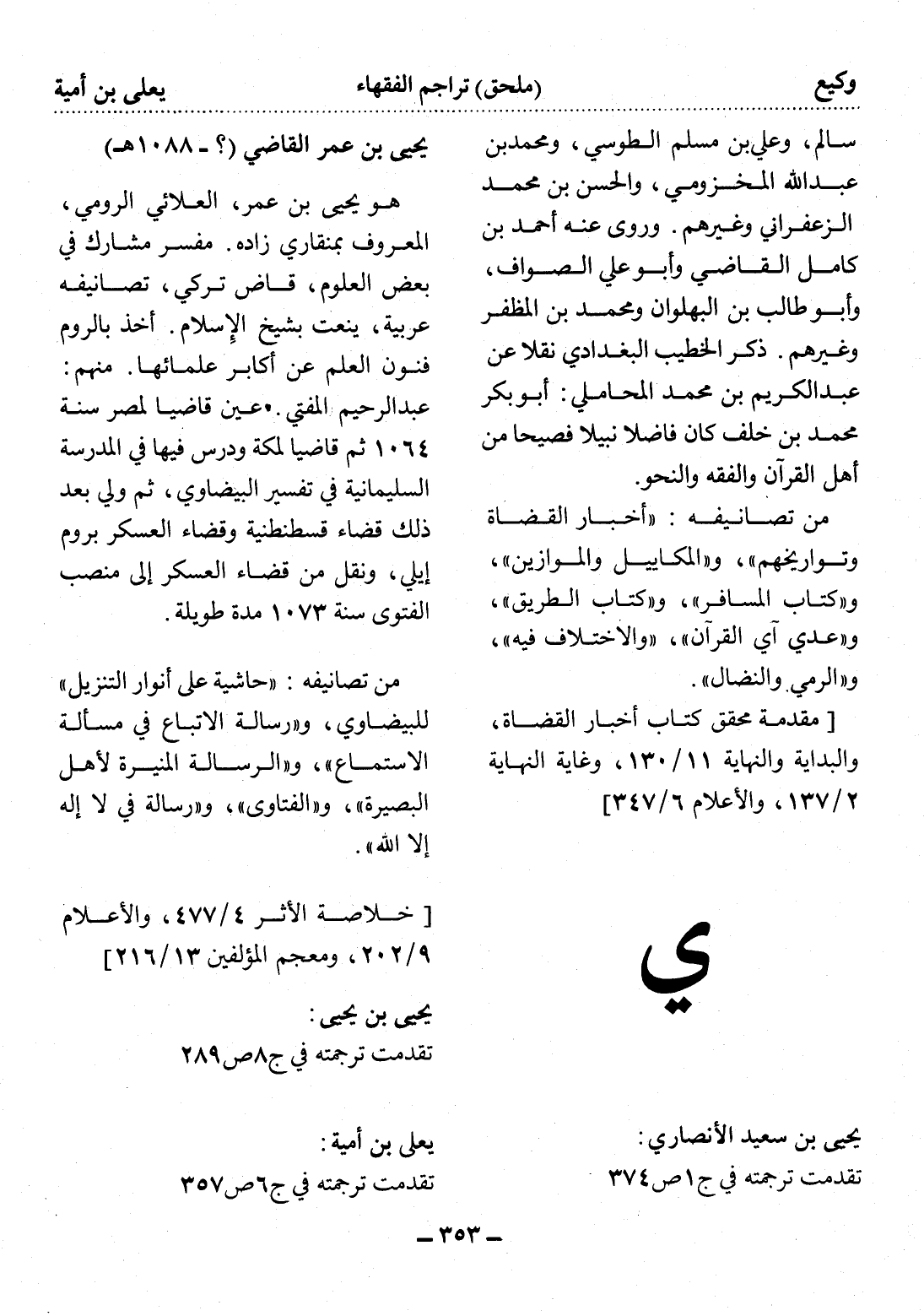 هو يحيى بن عمر، العلائي الرومي، المعروف بمنقاري زاده. مفسر مشارك في بعض العلوم، قاض تركي، تصانيفه عربية، ينعت بشيخ الإسلام. أخذ بالروم فنون العلم عن أكابر علمائها. منهم: عبد الرحيم المفتي. عين قاضيا لمصر سنة 1064 ثم قاضيا لمكة ودرس فيها في المدرسة السليمانية في تفسير البيضاوي، ثم ولي بعد ذلك قضاء قسطنطنية وقضاء العسكر بروم إيلي، ونقل من قضاء العسكر إلى منصب الفتوى سنة 1073 مدة طويلة. من تصانيفه: " حاشية على أنوار التنزيل " للبيضاوي، و " رسالة الاتباع في مسألة الاستماع "، و " الرسالة المنيرة لأهل البصيرة "، و " الفتاوى "، و " رسالة في لا إله إلا الله ". [خلاصة الأثر 4 / 477، والأعلام 9 / 202، ومعجم المؤلفين 13 / 216]