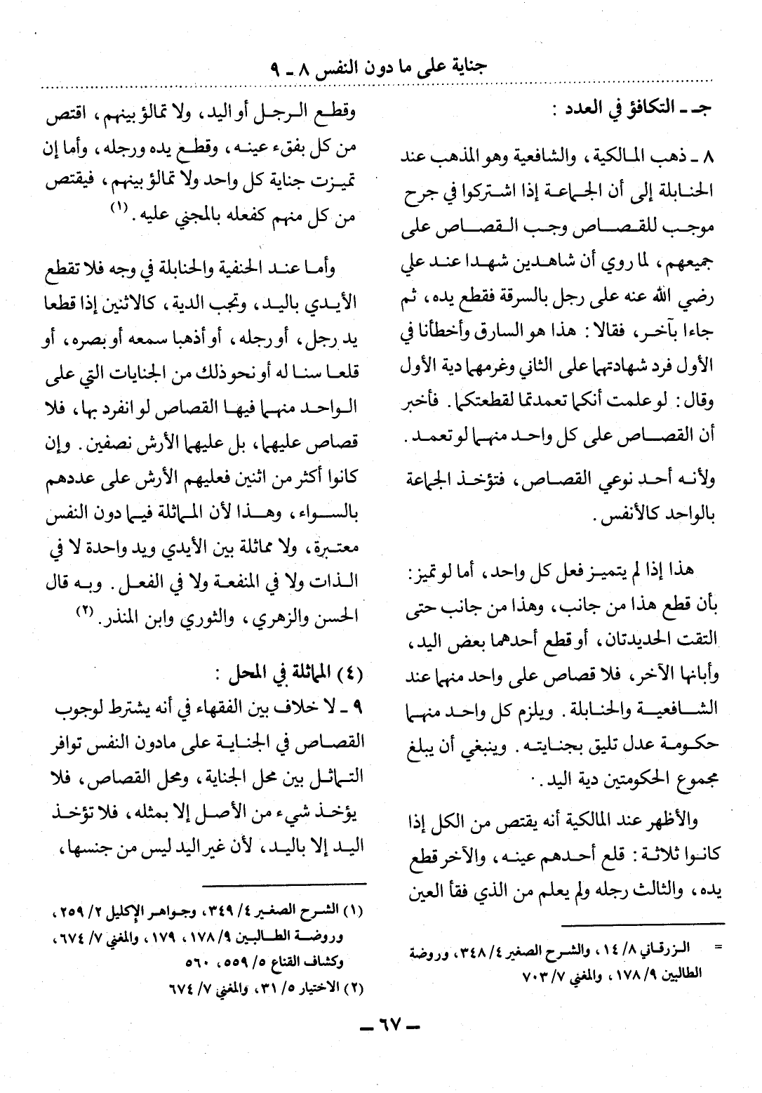 9 - لاَ خِلاَفَ بَيْنَ الْفُقَهَاءِ فِي أَنَّهُ يُشْتَرَطُ لِوُجُوبِ الْقِصَاصِ فِي الْجِنَايَةِ عَلَى مَا دُونَ النَّفْسِ تَوَافُرُ التَّمَاثُل بَيْنَ مَحَل الْجِنَايَةِ، وَمَحَل الْقِصَاصِ، فَلاَ يُؤْخَذُ شَيْءٌ مِنَ الأَْصْل إِلاَّ بِمِثْلِهِ، فَلاَ تُؤْخَذُ الْيَدُ إِلاَّ بِالْيَدِ؛ لأَِنَّ غَيْرَ الْيَدِ لَيْسَ مِنْ جِنْسِهَا،
