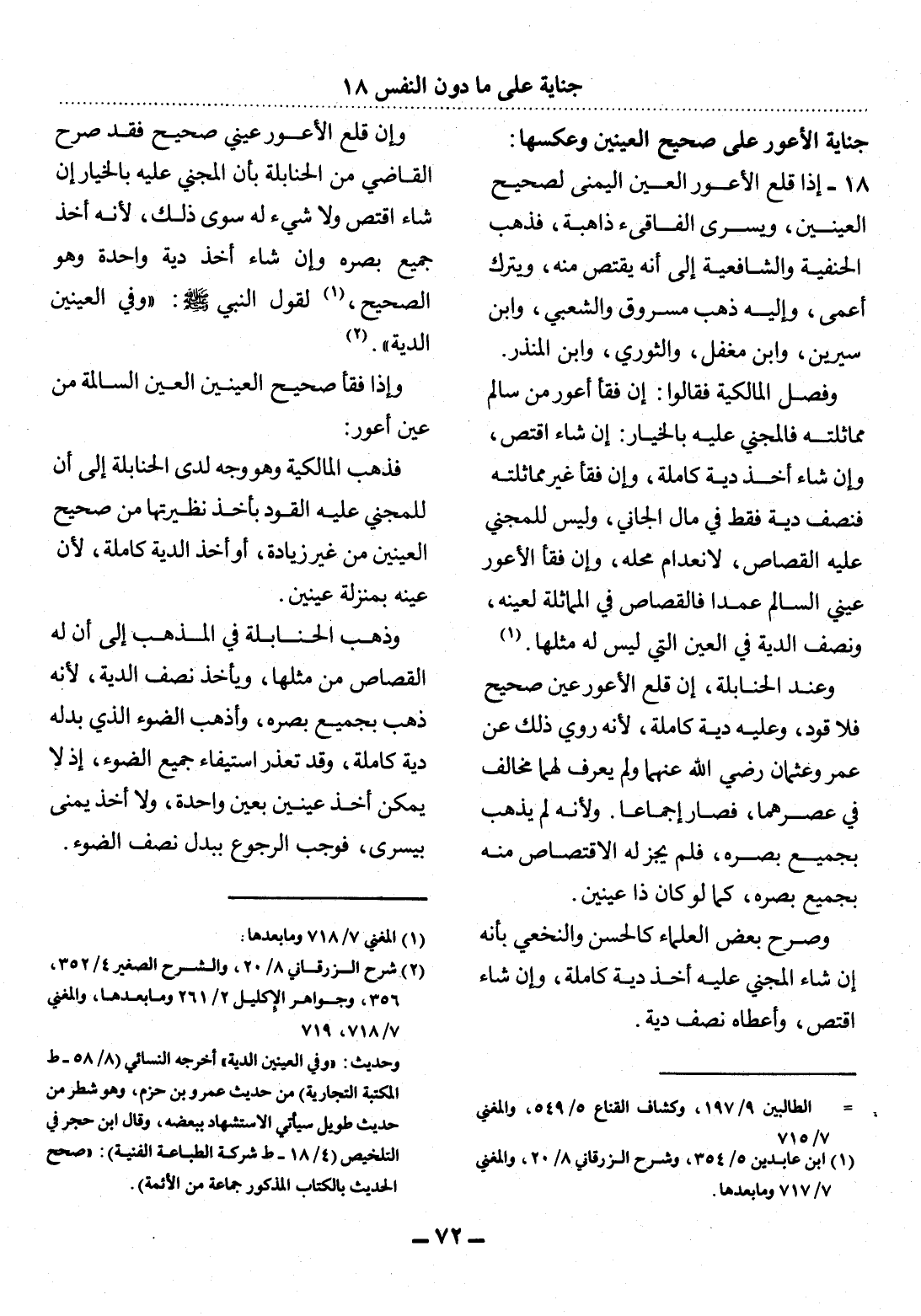 (2) شرح الزرقاني 8 / 20، والشرح الصغير 4 / 352، 356، وجواهر الإكليل 2 / 261 وما بعدها، والمغني 7 / 718، 719. وحديث: " وفي العينين الدية " أخرجه النسائي (8 / 58 - ط المكتبة التجارية) من حديث عمرو بن حزم، وهو شطر من حديث طويل سيأتي الاستشهاد ببعضه، وقال ابن حجر في التلخيص (4 / 18 - ط شركة الطباعة الفنية) : " صحح الحديث بالكتاب المذكور جماعة من الأئمة ".
