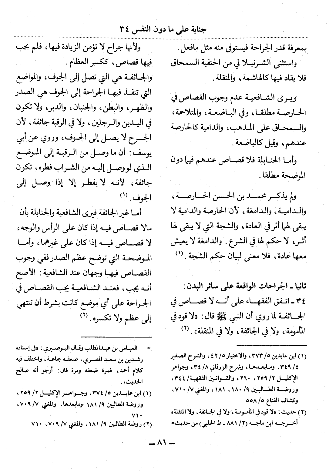 34 - اتَّفَقَ الْفُقَهَاءُ عَلَى أَنَّهُ لاَ قِصَاصَ فِي الْجَائِفَةِ لِمَا رُوِيَ أَنَّ النَّبِيَّ صَلَّى اللَّهُ عَلَيْهِ وَسَلَّمَ قَال: لاَ قَوَدَ فِي الْمَأْمُومَةِ، وَلاَ فِي الْجَائِفَةِ، وَلاَ فِي الْمُنَقِّلَةِ ( x662 ;) .