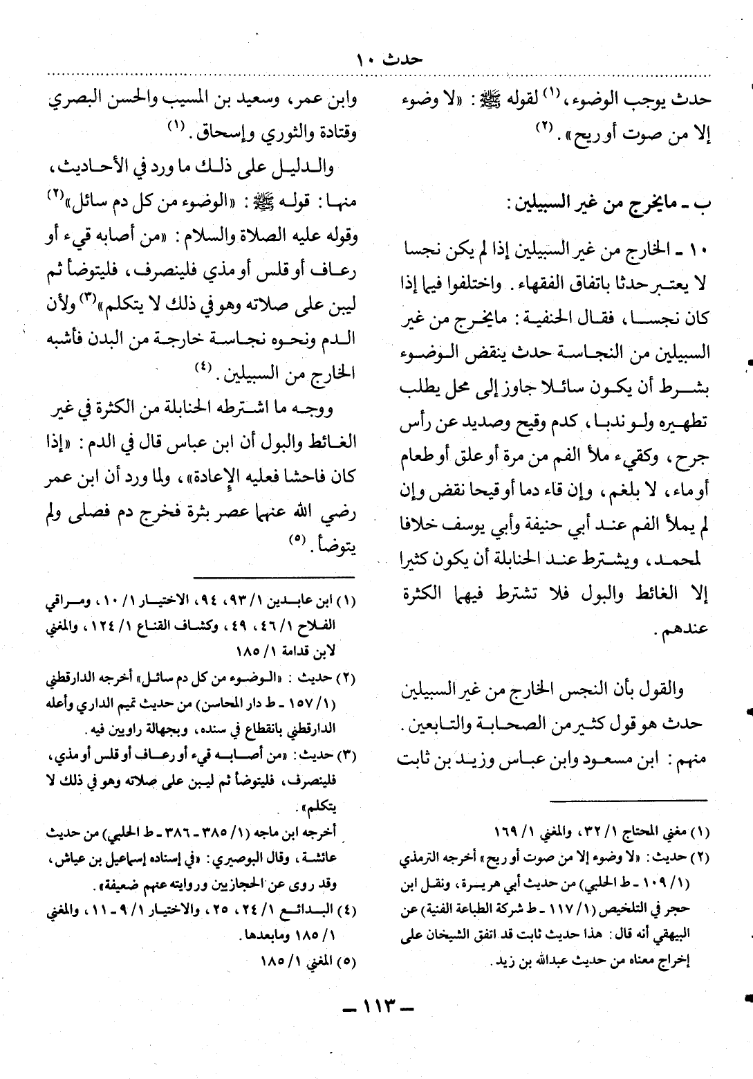 10 - الْخَارِجُ مِنْ غَيْرِ السَّبِيلَيْنِ إِذَا لَمْ يَكُنْ نَجِسًا لاَ يُعْتَبَرُ حَدَثًا بِاتِّفَاقِ الْفُقَهَاءِ. وَاخْتَلَفُوا فِيمَا إِذَا كَانَ نَجِسًا، فَقَال الْحَنَفِيَّةُ: مَا يَخْرُجُ مِنْ غَيْرِ السَّبِيلَيْنِ مِنَ النَّجَاسَةِ حَدَثٌ يَنْقُضُ الْوُضُوءَ بِشَرْطِ أَنْ يَكُونَ سَائِلاً جَاوَزَ إِلَى مَحَلٍّ يُطْلَبُ تَطْهِيرُهُ وَلَوْ نَدْبًا، كَدَمٍ وَقَيْحٍ وَصَدِيدٍ عَنْ رَأْسِ جُرْحٍ، وَكَقَيْءٍ مَلأََ الْفَمَ مِنْ مُرَّةٍ أَوْ عَلَقٍ أَوْ طَعَامٍ أَوْ مَاءٍ، لاَ بَلْغَمٍ، وَإِنْ قَاءَ دَمًا أَوْ قَيْحًا نَقَضَ وَإِنْ لَمْ يَمْلأَِ الْفَمَ عِنْدَ أَبِي حَنِيفَةَ وَأَبِي يُوسُفَ خِلاَفًا لِمُحَمَّدٍ، وَيُشْتَرَطُ عِنْدَ الْحَنَابِلَةِ أَنْ يَكُونَ كَثِيرًا إِلاَّ الْغَائِطَ وَالْبَوْل فَلاَ تُشْتَرَطُ فِيهِمَا الْكَثْرَةُ عِنْدَهُمْ.