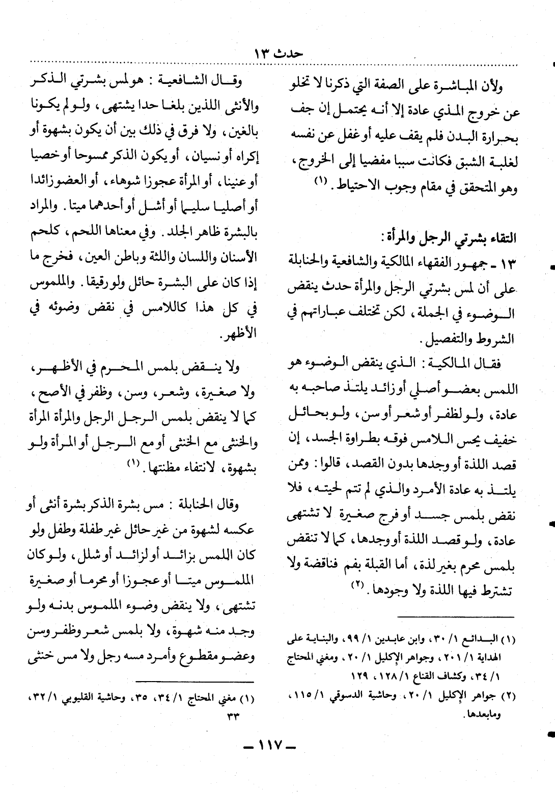 13 - جُمْهُورُ الْفُقَهَاءِ الْمَالِكِيَّةُ وَالشَّافِعِيَّةُ وَالْحَنَابِلَةُ عَلَى أَنَّ لَمْسَ بَشَرَتَيِ الرَّجُل وَالْمَرْأَةِ حَدَثٌ يَنْقُضُ الْوُضُوءَ فِي الْجُمْلَةِ، لَكِنْ تَخْتَلِفُ عِبَارَاتُهُمْ فِي الشُّرُوطِ وَالتَّفْصِيل.