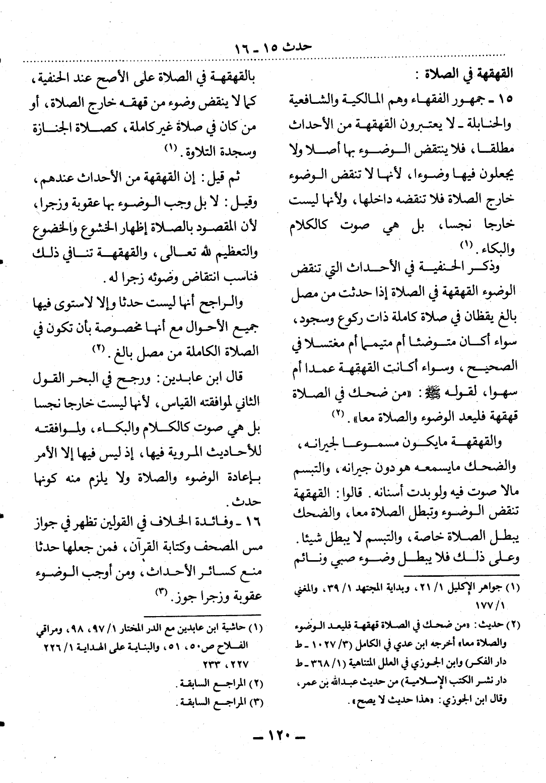 وَذَكَرَ الْحَنَفِيَّةُ فِي الأَْحْدَاثِ الَّتِي تَنْقُضُ الْوُضُوءَ الْقَهْقَهَةَ فِي الصَّلاَةِ إِذَا حَدَثَتْ مِنْ مُصَلٍّ بَالِغٍ يَقْظَانَ فِي صَلاَةٍ كَامِلَةٍ ذَاتِ رُكُوعٍ وَسُجُودٍ، سَوَاءٌ أَكَانَ مُتَوَضِّئًا أَمْ مُتَيَمِّمًا أَمْ مُغْتَسِلاً فِي الصَّحِيحِ، وَسَوَاءٌ أَكَانَتِ الْقَهْقَهَةُ عَمْدًا أَمْ سَهْوًا، لِقَوْلِهِ صَلَّى اللَّهُ عَلَيْهِ وَسَلَّمَ: مَنْ ضَحِكَ فِي الصَّلاَةِ قَهْقَهَةً فَلْيُعِدِ الْوُضُوءَ وَالصَّلاَةَ مَعًا (2) .