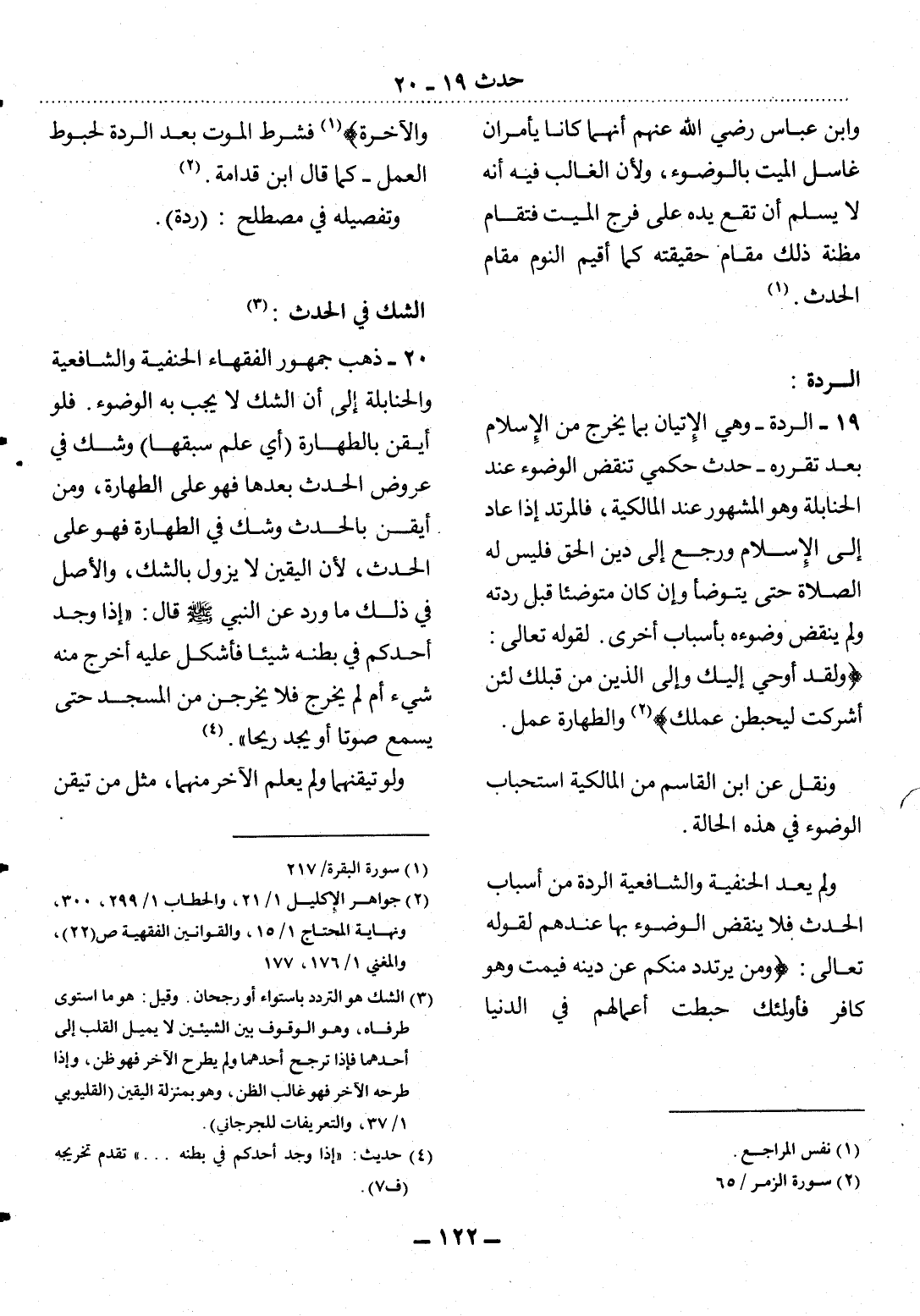 19 - الرِّدَّةُ - وَهِيَ الإِْتْيَانُ بِمَا يُخْرِجُ مِنَ الإِْسْلاَمِ بَعْدَ تَقَرُّرِهِ - حَدَثٌ حُكْمِيٌّ تَنْقُضُ الْوُضُوءَ عِنْدَ الْحَنَابِلَةِ وَهُوَ الْمَشْهُورُ عِنْدَ الْمَالِكِيَّةِ، فَالْمُرْتَدُّ إِذَا عَادَ إِلَى الإِْسْلاَمِ وَرَجَعَ إِلَى دِينِ الْحَقِّ فَلَيْسَ لَهُ الصَّلاَةُ حَتَّى يَتَوَضَّأَ وَإِنْ كَانَ مُتَوَضِّئًا قَبْل رِدَّتِهِ وَلَمْ يُنْقَضْ وُضُوءُهُ بِأَسْبَابٍ أُخْرَى. لِقَوْلِهِ تَعَالَى: {وَلَقَدْ أُوحِيَ إِلَيْكَ وَإِلَى الَّذِينَ مِنْ قَبْلِكَ لَئِنْ أَشْرَكْتَ لَيَحْبَطَنَّ عَمَلُكَ (2) } وَالطَّهَارَةُ عَمَلٌ.