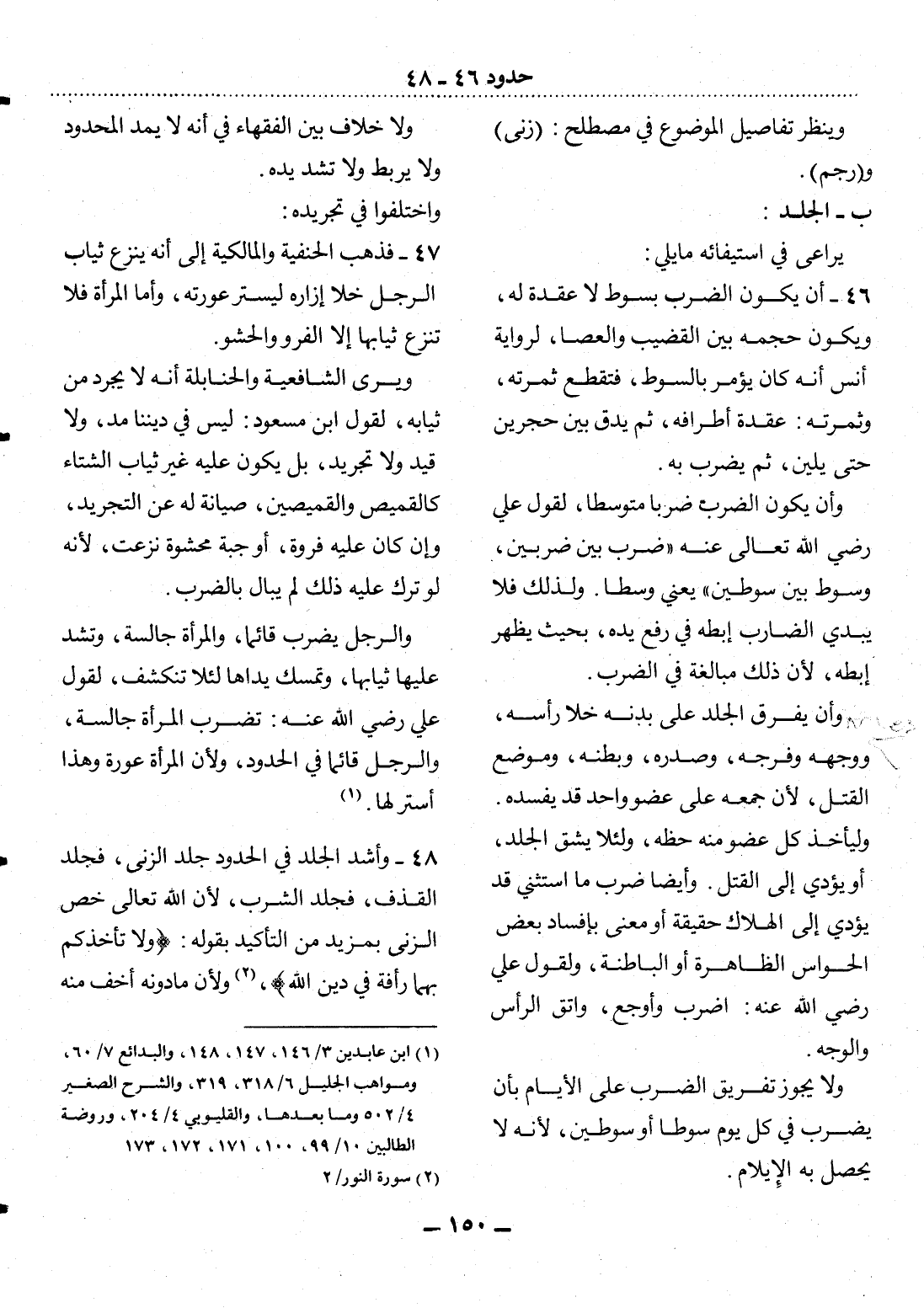48 - وَأَشَدُّ الْجَلْدِ فِي الْحُدُودِ جَلْدُ الزِّنَى، فَجَلْدُ الْقَذْفِ، فَجَلْدُ الشُّرْبِ، لأَِنَّ اللَّهَ تَعَالَى خَصَّ الزِّنَى بِمَزِيدٍ مِنَ التَّأْكِيدِ بِقَوْلِهِ: {وَلاَ تَأْخُذْكُمْ بِهِمَا رَأْفَةٌ فِي دِينِ اللَّهِ (2) } ، وَلأَِنَّ مَا دُونَهُ أَخَفُّ مِنْهُ