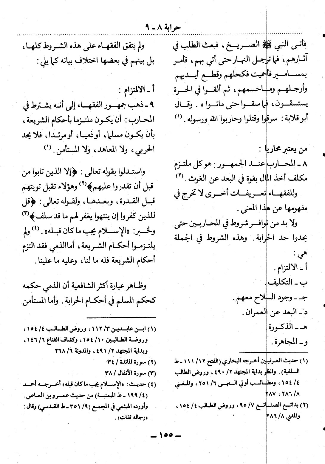 9 - ذَهَبَ جُمْهُورُ الْفُقَهَاءِ إِِلَى أَنَّهُ يُشْتَرَطُ فِي الْمُحَارِبِ: أَنْ يَكُونَ مُلْتَزِمًا بِأَحْكَامِ الشَّرِيعَةِ، بِأَنْ يَكُونَ مُسْلِمًا، أَوْ ذِمِّيًّا، أَوْ مُرْتَدًّا، فَلاَ يُحَدُّ الْحَرْبِيُّ، وَلاَ الْمُعَاهَدُ، وَلاَ الْمُسْتَأْمَنُ (1) .