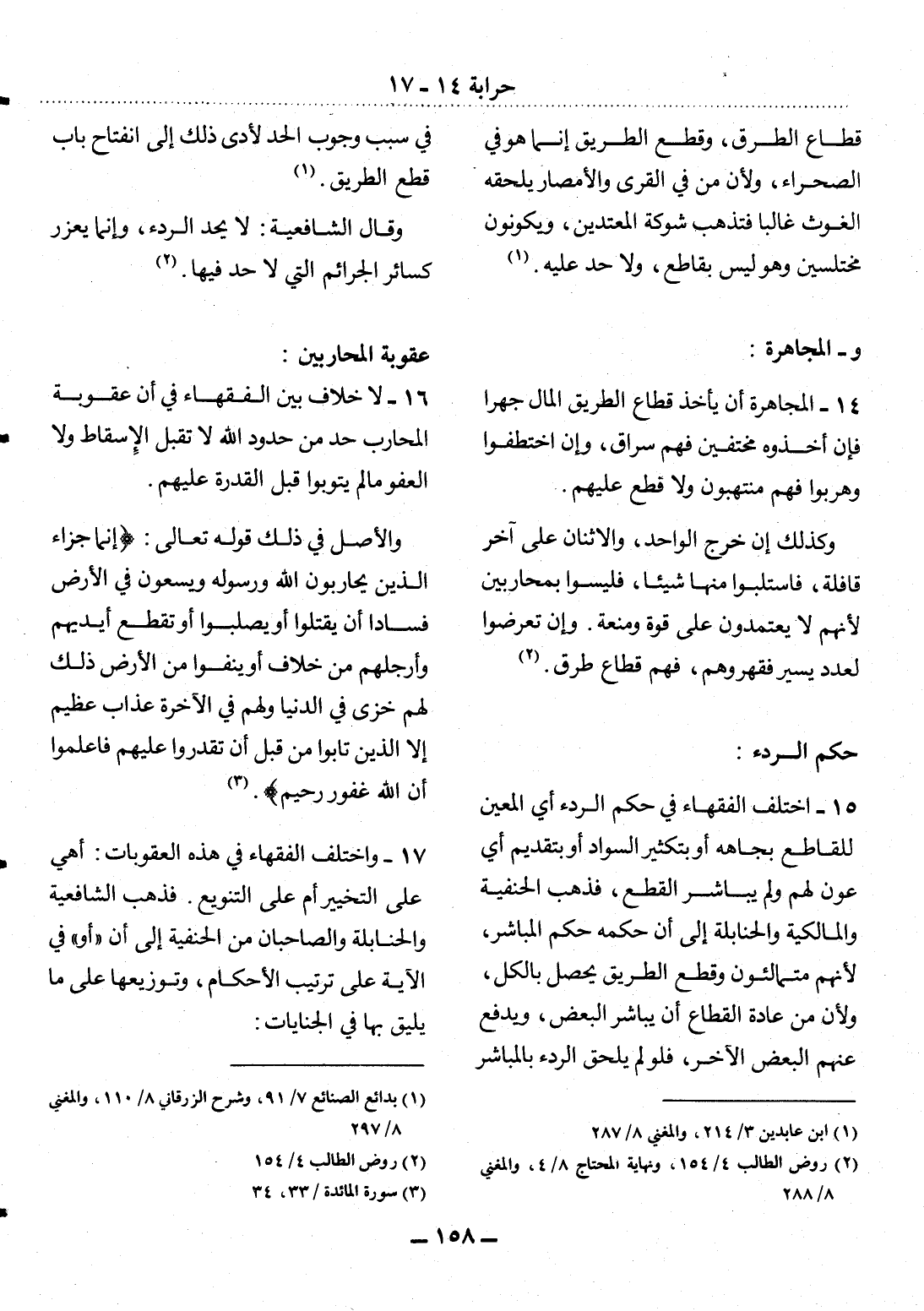 14 - الْمُجَاهَرَةُ أَنْ يَأْخُذَ قُطَّاعُ الطَّرِيقِ الْمَال جَهْرًا فَإِِنْ أَخَذُوهُ مُخْتَفِينَ فَهُمْ سُرَّاقٌ، وَإِِنِ اخْتَطَفُوا وَهَرَبُوا فَهُمْ مُنْتَهِبُونَ وَلاَ قَطْعَ عَلَيْهِمْ.