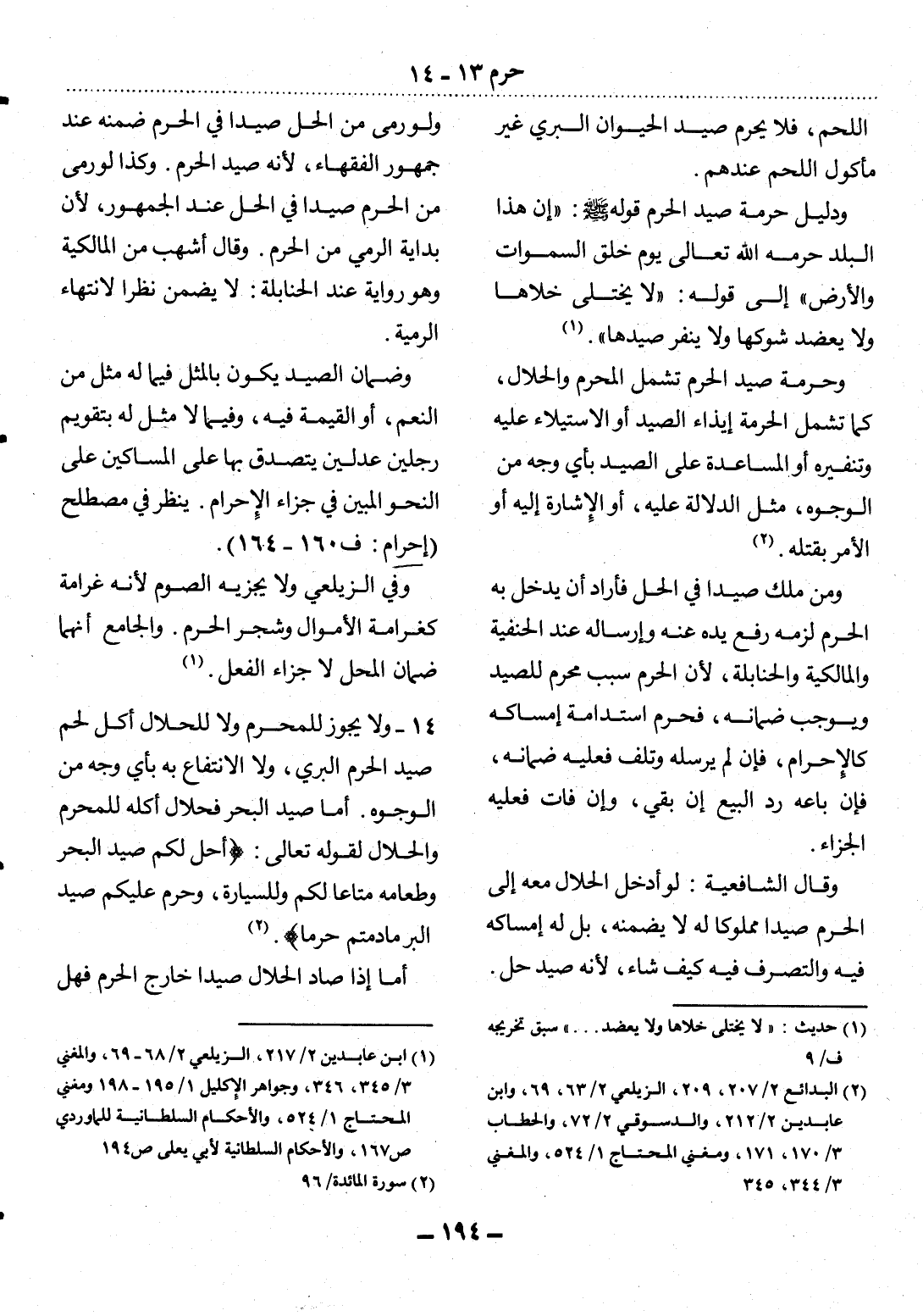 14 - وَلاَ يَجُوزُ لِلْمُحْرِمِ وَلاَ لِلْحَلاَل أَكْل لَحْمِ صَيْدِ الْحَرَمِ الْبَرِّيِّ، وَلاَ الاِنْتِفَاعُ بِهِ بِأَيِّ وَجْهٍ مِنَ الْوُجُوهِ. أَمَّا صَيْدُ الْبَحْرِ فَحَلاَلٌ أَكْلُهُ لِلْمُحْرِمِ وَالْحَلاَل لِقَوْلِهِ تَعَالَى: {أُحِل لَكُمْ صَيْدُ الْبَحْرِ وَطَعَامُهُ مَتَاعًا لَكُمْ وَلِلسَّيَّارَةِ وَحُرِّمَ عَلَيْكُمْ صَيْدُ الْبَرِّ مَا دُمْتُمْ حُرُمًا (2) } .