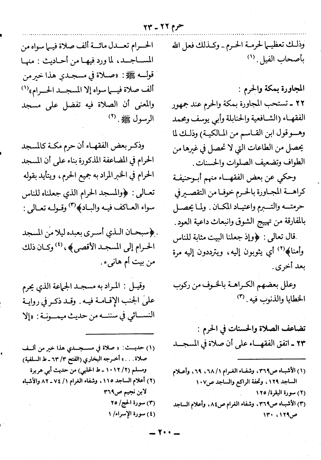وَذَكَرَ بَعْضُ الْفُقَهَاءِ أَنَّ حَرَمَ مَكَّةَ كَالْمَسْجِدِ الْحَرَامِ فِي الْمُضَاعَفَةِ الْمَذْكُورَةِ بِنَاءً عَلَى أَنَّ الْمَسْجِدَ الْحَرَامَ فِي الْخَبَرِ الْمُرَادُ بِهِ جَمِيعُ الْحَرَمِ، وَيَتَأَيَّدُ بِقَوْلِهِ تَعَالَى: {وَالْمَسْجِدِ الْحَرَامِ الَّذِي جَعَلْنَاهُ لِلنَّاسِ سَوَاءً الْعَاكِفُ فِيهِ وَالَبَّادِ} (3) وقَوْله تَعَالَى: {سُبْحَانَ الَّذِي أَسْرَى بِعَبْدِهِ لَيْلاً مِنَ الْمَسْجِدِ الْحَرَامِ إِِلَى الْمَسْجِدِ الأَْقْصَى} (4) ، وَكَانَ ذَلِكَ مِنْ بَيْتِ أُمِّ هَانِئٍ.