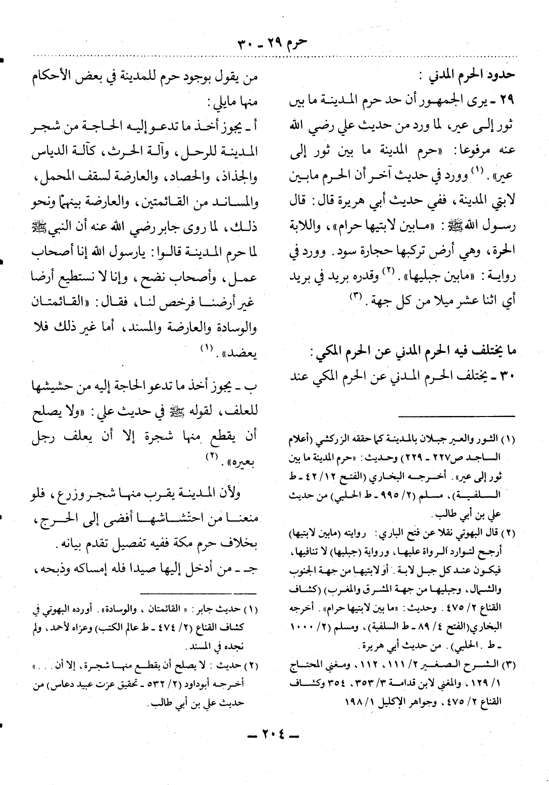 29 - يَرَى الْجُمْهُورُ أَنَّ حَدَّ حَرَمِ الْمَدِينَةِ مَا بَيْنَ ثَوْرٍ إِِلَى عِيرٍ، لِمَا وَرَدَ مِنْ حَدِيثِ عَلِيٍّ رَضِيَ اللَّهُ عَنْهُ مَرْفُوعًا: حَرَمُ الْمَدِينَةِ مَا بَيْنَ ثَوْرٍ إِِلَى عِيرٍ (1) . وَوَرَدَ فِي حَدِيثٍ آخَرَ أَنَّ الْحَرَمَ مَا بَيْنَ لاَبَتَيْ الْمَدِينَةِ، فَفِي حَدِيثِ أَبِي هُرَيْرَةَ قَال: قَال رَسُول اللَّهِ صَلَّى اللَّهُ عَلَيْهِ وَسَلَّمَ: مَا بَيْنَ لاَبَتَيْهَا حَرَامٌ، وَاللاَّبَةُ الْحَرَّةُ، وَهِيَ أَرْضٌ تَرْكَبُهَا حِجَارَةٌ سُودٌ. وَوَرَدَ فِي رِوَايَةٍ: مَا بَيْنَ جَبَلَيْهَا. (2) . وَقَدْرُهُ بَرِيدٌ فِي بَرِيدٍ أَيِ اثْنَا عَشَرَ مِيلاً مِنْ كُل جِهَةٍ (3) .
