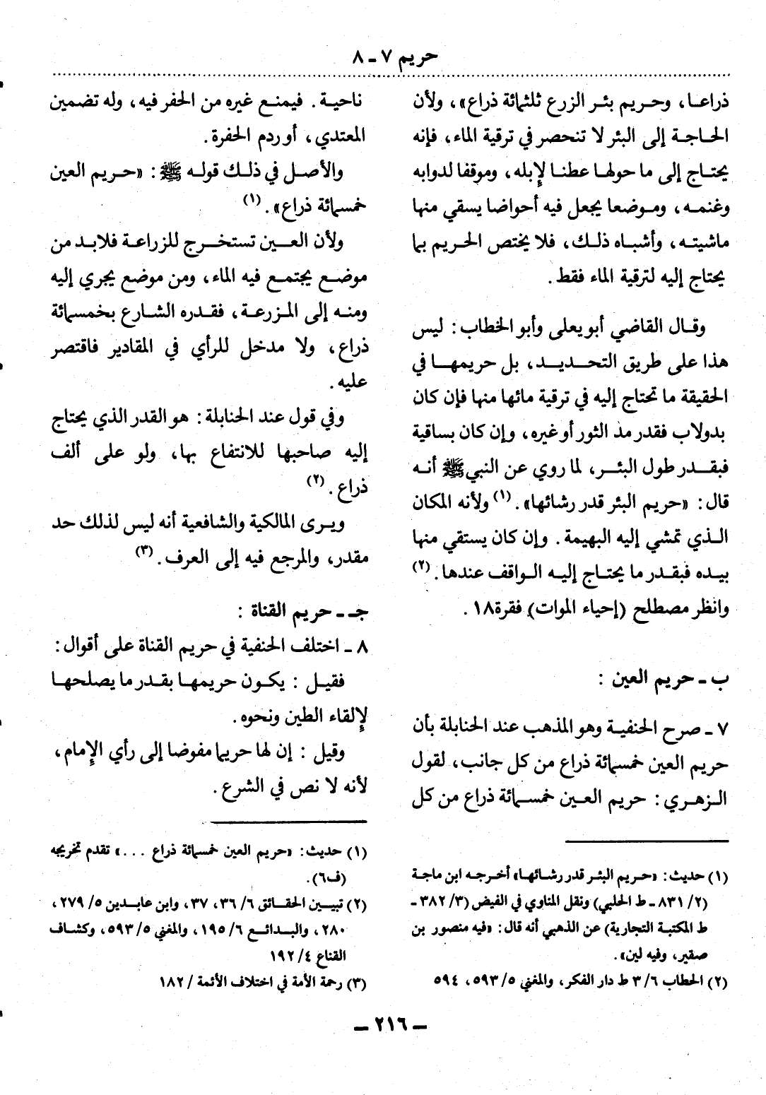 7 - صَرَّحَ الْحَنَفِيَّةُ وَهُوَ الْمَذْهَبُ عِنْدَ الْحَنَابِلَةِ بِأَنَّ حَرِيمَ الْعَيْنِ خَمْسُمِائَةِ ذِرَاعٍ مِنْ كُل جَانِبٍ، لِقَوْل الزُّهْرِيِّ: حَرِيمُ الْعَيْنِ خَمْسُمِائَةِ ذِرَاعٍ مِنْ كُل