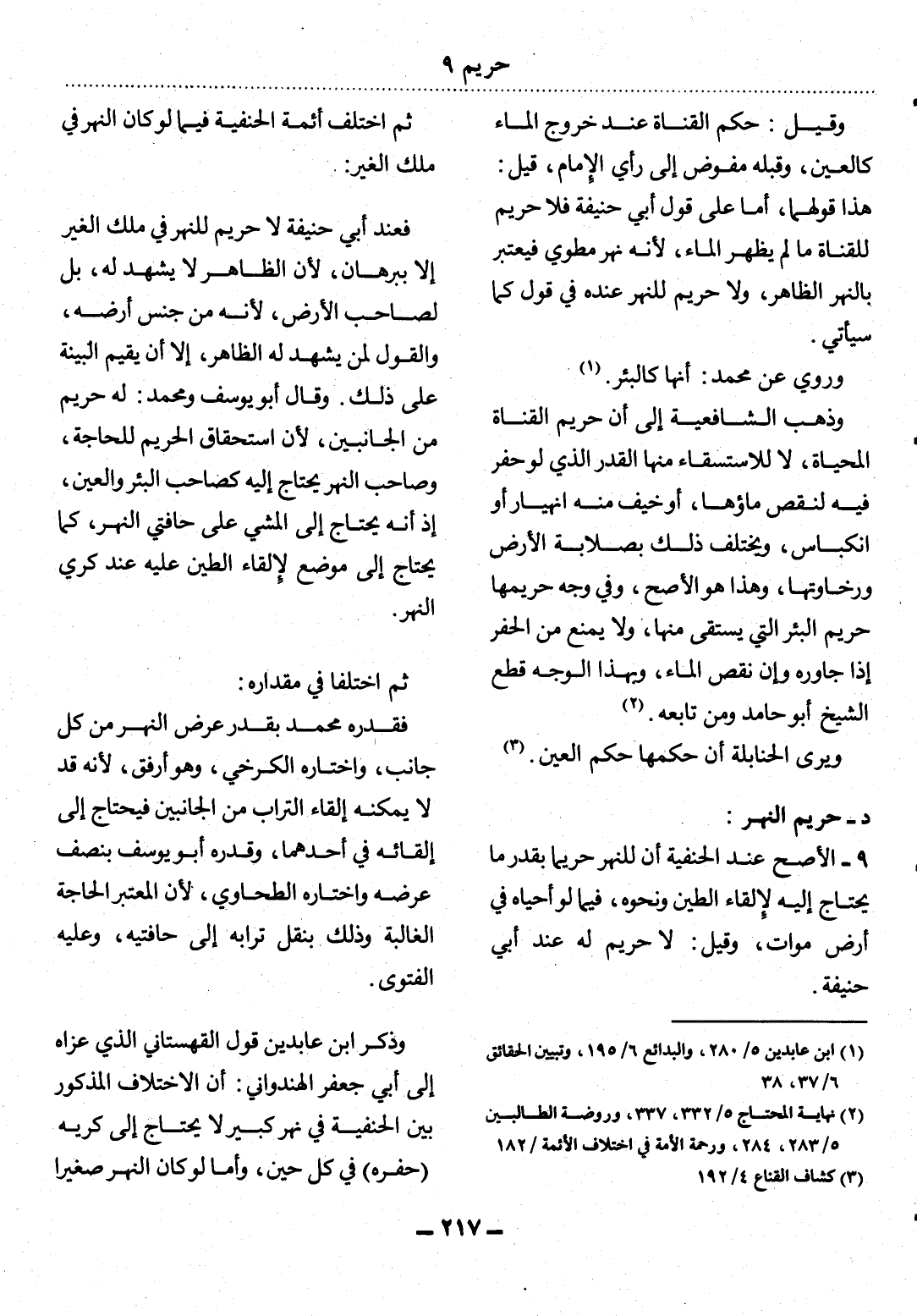 9 - الأَْصَحُّ عِنْدَ الْحَنَفِيَّةِ أَنَّ لِلنَّهْرِ حَرِيمًا بِقَدْرِ مَا يَحْتَاجُ إِلَيْهِ لإِِِلْقَاءِ الطِّينِ وَنَحْوِهِ، فِيمَا لَوْ أَحْيَاهُ فِي أَرْضٍ مَوَاتٍ، وَقِيل: لاَ حَرِيمَ لَهُ عِنْدَ أَبِي حَنِيفَةَ.