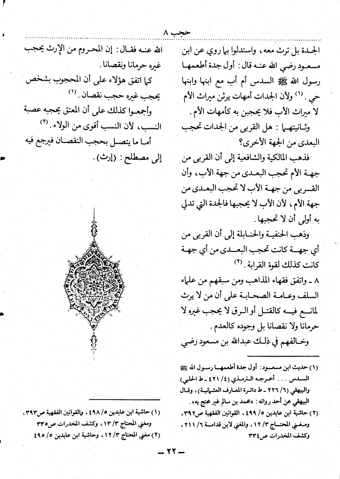 8 - وَاتَّفَقَ فُقَهَاءُ الْمَذَاهِبِ وَمَنْ سَبَقَهُمْ مِنْ عُلَمَاءِ السَّلَفِ وَعَامَّةِ الصَّحَابَةِ عَلَى أَنَّ مَنْ لاَ يَرِثُ لِمَانِعٍ فِيهِ كَالْقَتْل أَوْ الرِّقِّ لاَ يَحْجُبُ غَيْرَهُ لاَ حِرْمَانًا وَلاَ نُقْصَانًا بَل وُجُودُهُ كَالْعَدَمِ.