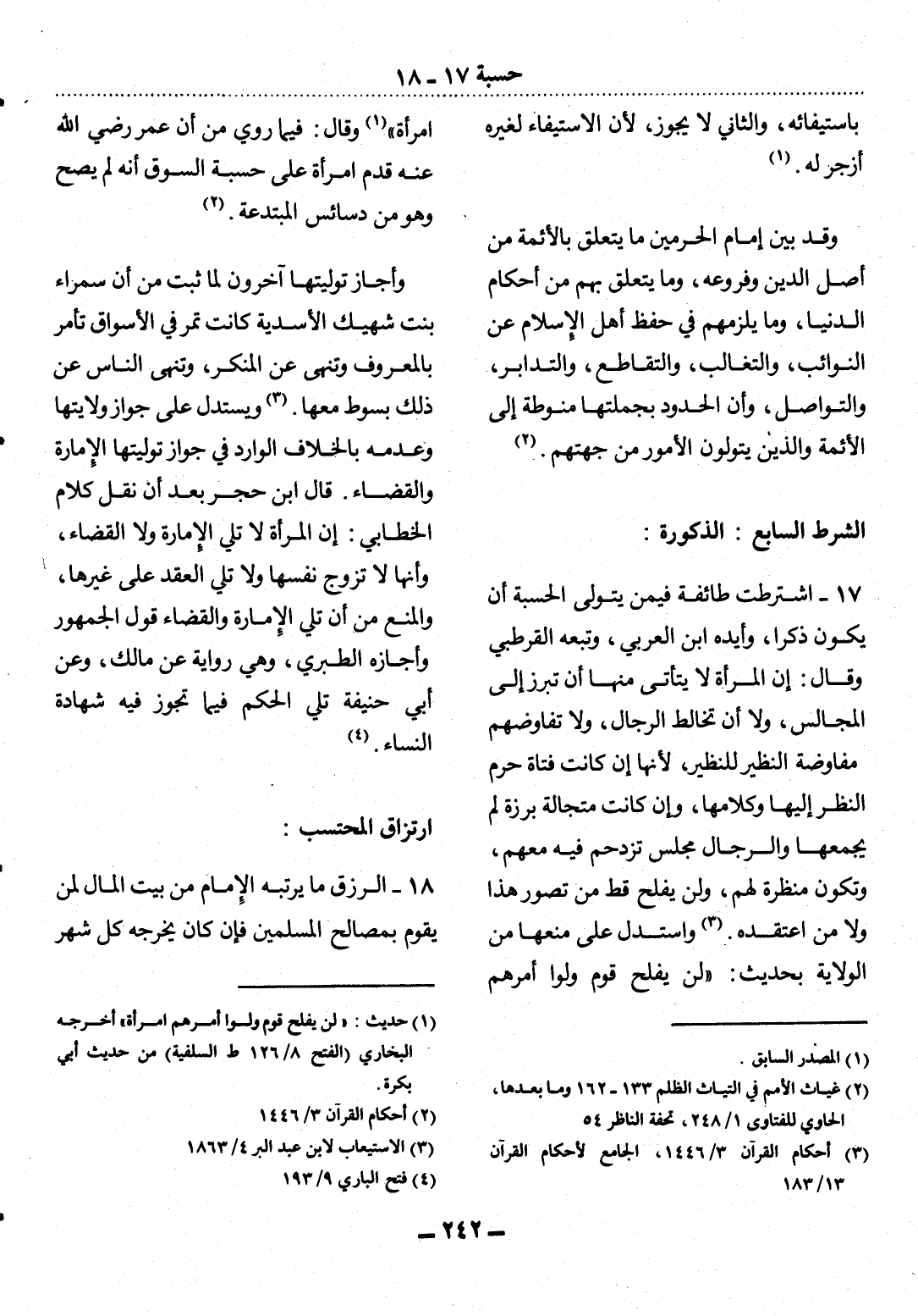 17 - اشْتَرَطَتْ طَائِفَةٌ فِيمَنْ يَتَوَلَّى الْحِسْبَةَ أَنْ يَكُونَ ذَكَرًا، وَأَيَّدَهُ ابْنُ الْعَرَبِيِّ، وَتَبِعَهُ الْقُرْطُبِيُّ وَقَال: إِنَّ الْمَرْأَةَ لاَ يَتَأَتَّى مِنْهَا أَنْ تَبْرُزَ إِِلَى الْمَجَالِسِ، وَلاَ أَنْ تُخَالِطَ الرِّجَال، وَلاَ تُفَاوِضَهُمْ مُفَاوَضَةَ النَّظِيرِ لِلنَّظِيرِ، لأَِنَّهَا إِنْ كَانَتْ فَتَاةً حَرُمَ النَّظَرُ إِلَيْهَا وَكَلاَمُهَا، وَإِِنْ كَانَتْ مُتَجَالَّةً بَرِزَةً لَمْ يَجْمَعْهَا وَالرِّجَال مَجْلِسٌ تَزْدَحِمُ فِيهِ مَعَهُمْ، وَتَكُونُ مُنَظِّرَةً لَهُمْ، وَلَنْ يُفْلِحَ قَطُّ مَنْ تَصَوَّرَ هَذَا وَلاَ مَنِ اعْتَقَدَهُ (3) . وَاسْتُدِل عَلَى مَنْعِهَا مِنَ الْوِلاَيَةِ بِحَدِيثِ: لَنْ يُفْلِحَ قَوْمٌ وَلَّوْا أَمْرَهُمْ
