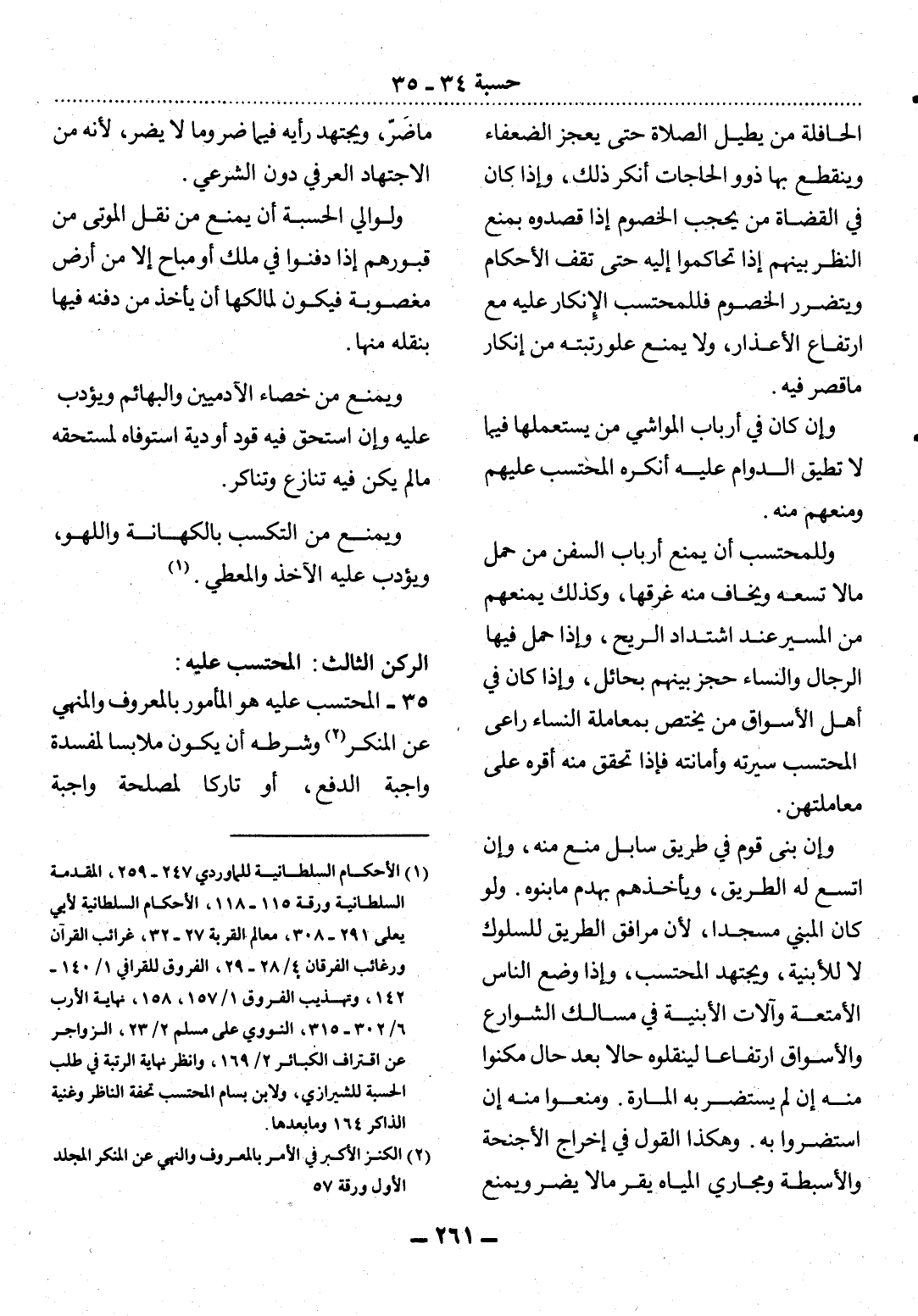 (1) الأحكام السلطانية للماوردي 247 - 259، المقدمة السلطانية ورقة 115 - 118، الأحكام السلطانية لأبي يعلى 291 - 308، معالم القربة 27 - 32، غرائب القرآن ورغائب الفرقان 4 / 28 - 29، الفروق للقرافي 1 / 140 - 142، وتهذيب الفروق 1 / 157، 158، نهاية الأرب 6 / 302 - 315، النووي على مسلم 2 / 23، الزواجر عن اقتراف الكبائر 2 / 169، وانظر نهاية الرتبة في طلب الحسبة للشيرازي، ولابن بسام المحتسب تحفة الناظر وغنية الذاكر 164 وما بعدها.