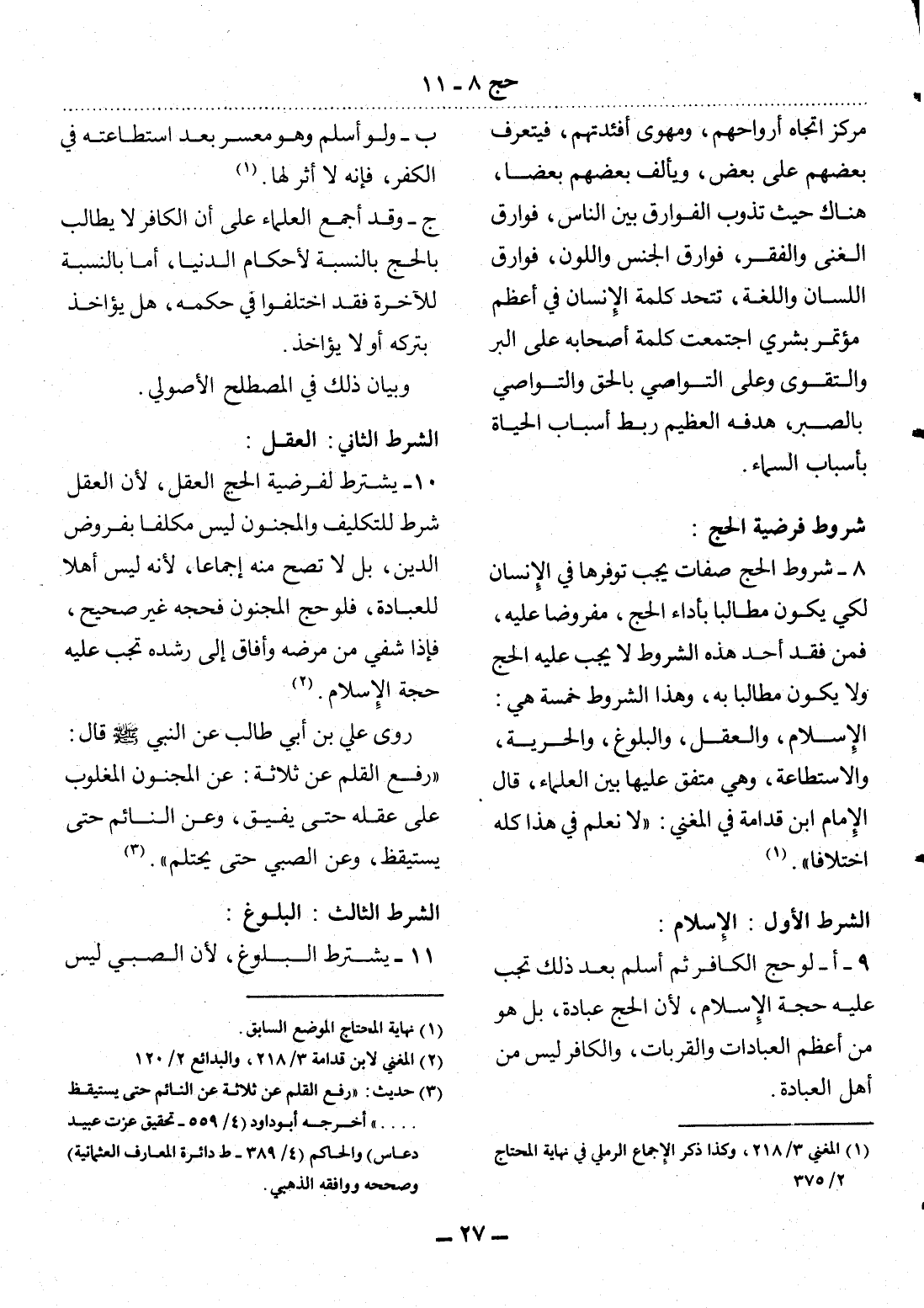 8 - شُرُوطُ الْحَجِّ صِفَاتٌ يَجِبُ تَوَفُّرُهَا فِي الإِْنْسَانِ لِكَيْ يَكُونَ مُطَالَبًا بِأَدَاءِ الْحَجِّ، مَفْرُوضًا عَلَيْهِ، فَمَنْ فَقَدَ أَحَدَ هَذِهِ الشُّرُوطِ لاَ يَجِبُ عَلَيْهِ الْحَجُّ وَلاَ يَكُونُ مُطَالَبًا بِهِ، وَهَذِهِ الشُّرُوطُ خَمْسَةٌ هِيَ: الإِْسْلاَمُ، وَالْعَقْل، وَالْبُلُوغُ، وَالْحُرِّيَّةُ، وَالاِسْتِطَاعَةُ، وَهِيَ مُتَّفَقٌ عَلَيْهَا بَيْنَ الْعُلَمَاءِ، قَال الإِْمَامُ ابْنُ قُدَامَةَ فِي الْمُغْنِي: لاَ نَعْلَمُ فِي هَذَا كُلِّهِ اخْتِلاَفًا " (1) .