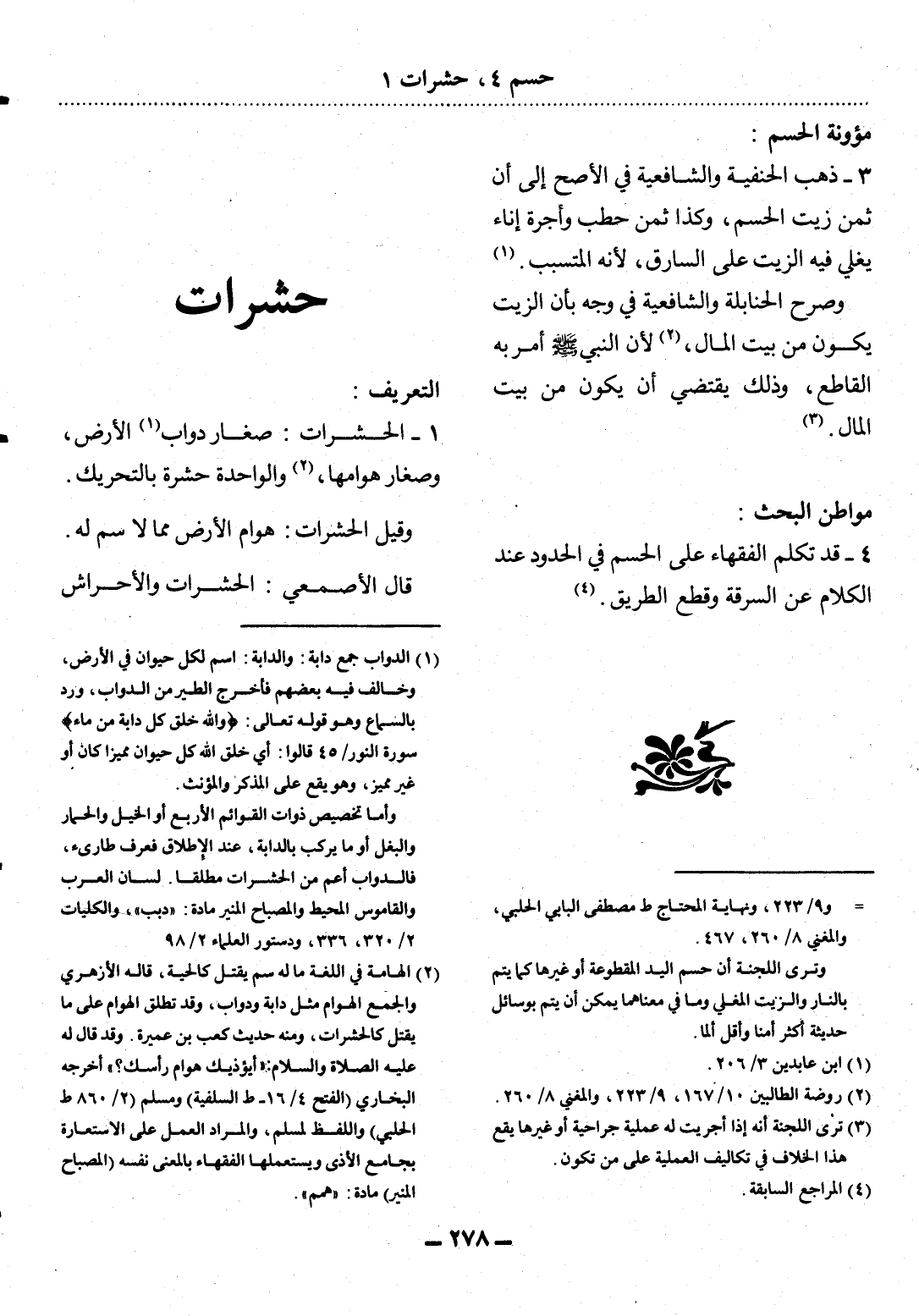 1 - الْحَشَرَاتُ: صِغَارُ دَوَابِّ (1) الأَْرْضِ، وَصِغَارُ هَوَامِّهَا (2) ، وَالْوَاحِدَةُ حَشَرَةٌ بِالتَّحْرِيكِ.