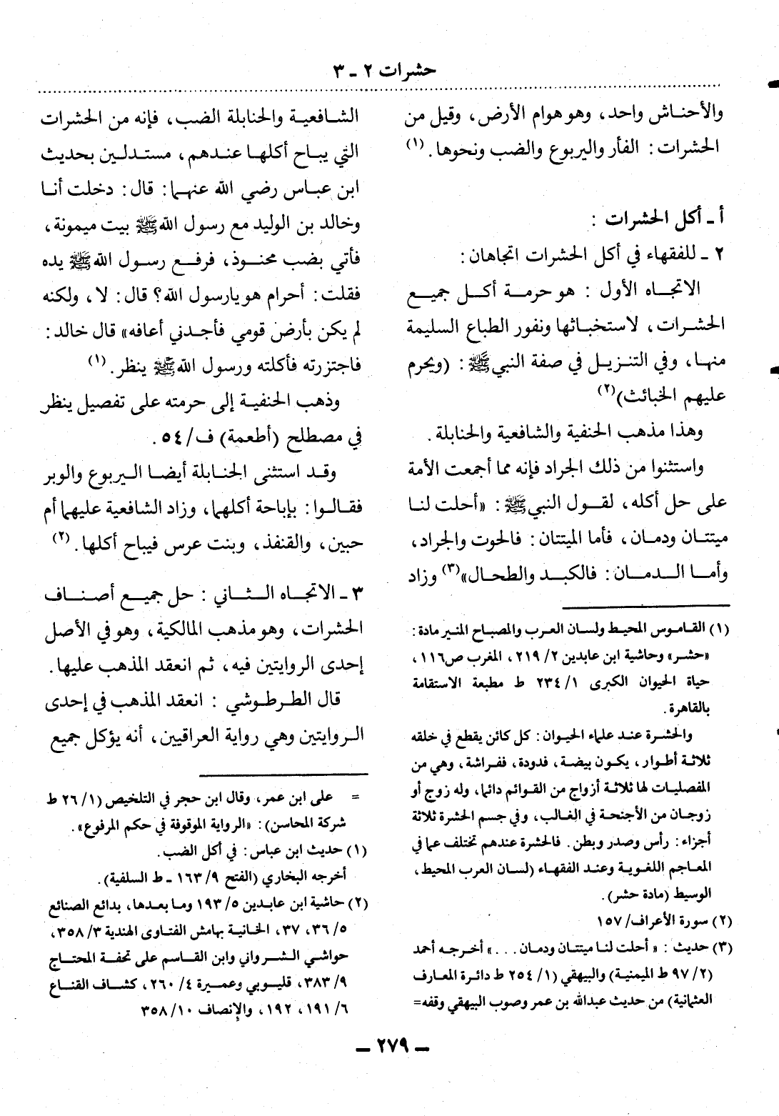 (1) القاموس المحيط ولسان العرب والمصباح المنير مادة: " حشر " وحاشية ابن عابدين 2 / 219، المغرب ص 116، حياة الحيوان الكبرى 1 / 234 ط مطبعة الاستقامة بالقاهرة. والحشرة عند علماء الحيوان: كل كائن يقطع في خلقه ثلاثة أطوار، يكون بيضة، فدودة، ففراشة، وهي من المفصليات لها ثلاثة أزواج من القوائم دائما، وله زوج أو زوجان من الأجنحة في الغالب، وفي جسم الحشرة ثلاثة أجزاء: رأس وصدر وبطن. فالحشرة عندهم تختلف عما ف لسان العرب المحيط، الوسيط، مادة حشر) .