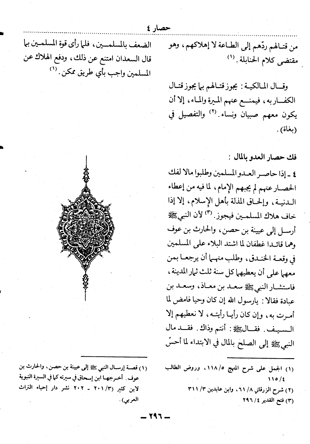 4 - إِذَا حَاصَرَ الْعَدُوُّ الْمُسْلِمِينَ وَطَلَبُوا مَالاً لِفَكِّ الْحِصَارِ عَنْهُمْ لَمْ يُجِبْهُمُ الإِِْمَامُ، لِمَا فِيهِ مِنْ إِعْطَاءِ الدَّنِيَّةِ، وَإِِلْحَاقِ الْمَذَلَّةِ بِأَهْل الإِِْسْلاَمِ، إِلاَّ إِذَا خَافَ هَلاَكَ الْمُسْلِمِينَ فَيَجُوزُ (3) . لأَِنَّ النَّبِيَّ صَلَّى اللَّهُ عَلَيْهِ وَسَلَّمَ أَرْسَل إِِلَى عُيَيْنَةَ بْنِ حِصْنٍ، وَالْحَارِثِ بْنِ عَوْفٍ وَهُمَا قَائِدَا غَطَفَانَ لَمَّا اشْتَدَّ الْبَلاَءُ عَلَى الْمُسْلِمِينَ فِي وَقْعَةِ الْخَنْدَقِ، وَطَلَبَ مِنْهُمَا أَنْ يَرْجِعَا بِمَنْ مَعَهُمَا عَلَى أَنْ يُعْطِيَهُمَا كُل سَنَةٍ ثُلُثَ ثِمَارِ الْمَدِينَةِ، فَاسْتَشَارَ النَّبِيُّ صَلَّى اللَّهُ عَلَيْهِ وَسَلَّمَ سَعْدَ بْنَ مُعَاذٍ، وَسَعْدَ بْنَ عُبَادَةَ فَقَالاَ: يَا رَسُول اللَّهِ إِنْ كَانَ وَحْيًا فَامْضِ لِمَا أُمِرْتَ بِهِ، وَإِِنْ كَانَ رَأْيًا رَأَيْتَهُ، لاَ نُعْطِيهِمْ إِلاَّ السَّيْفَ. فَقَال صَلَّى اللَّهُ عَلَيْهِ وَسَلَّمَ: أَنْتُمْ وَذَاكَ. فَقَدْ مَال النَّبِيُّ صَلَّى اللَّهُ عَلَيْهِ وَسَلَّمَ إِِلَى الصُّلْحِ بِالْمَال فِي الاِبْتِدَاءِ لَمَّا أَحَسَّ