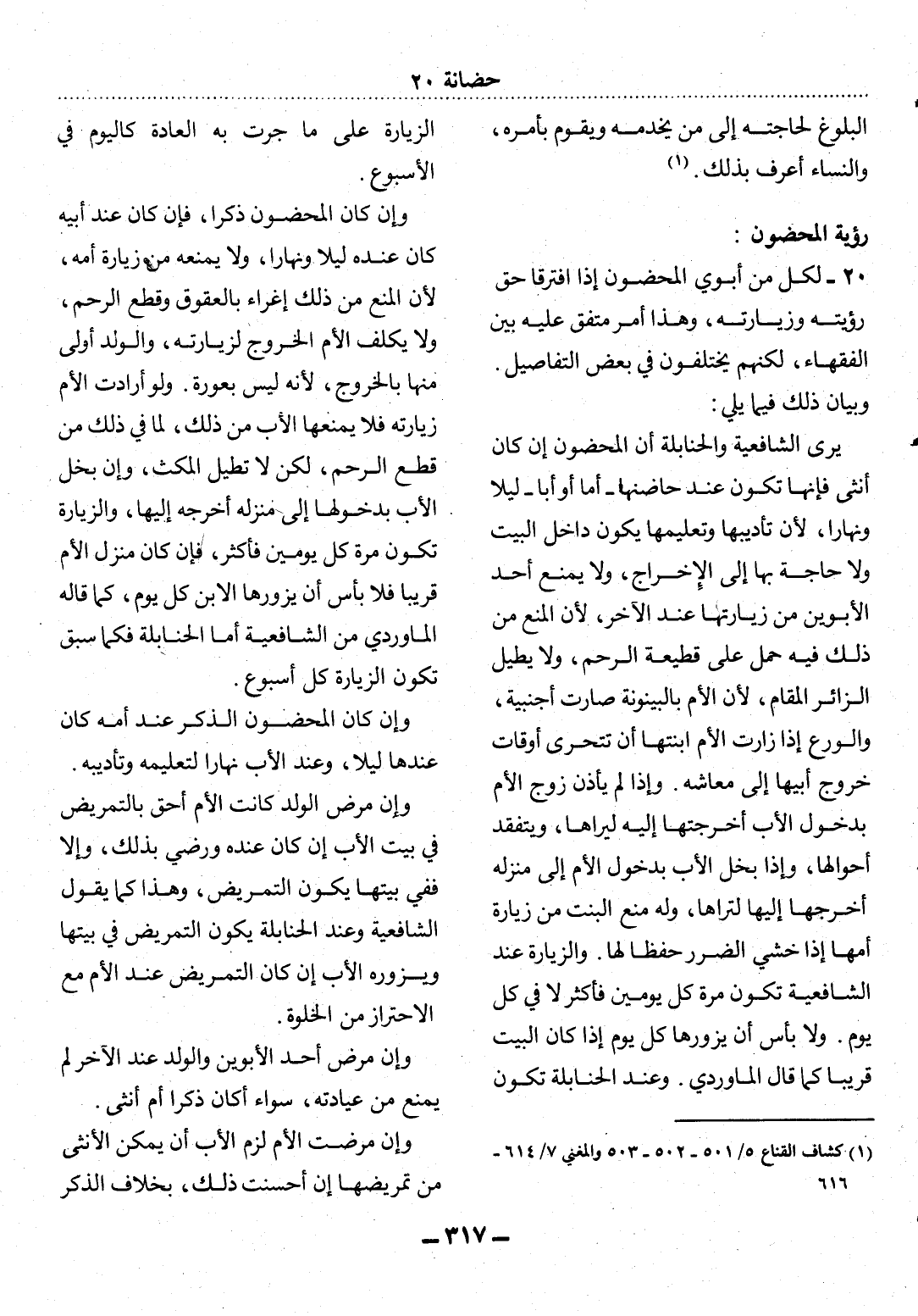 20 - لِكُلٍّ مِنْ أَبَوَيِ الْمَحْضُونِ إِِذَا افْتَرَقَا حَقُّ رُؤْيَتِهِ وَزِيَارَتِهِ، وَهَذَا أَمْرٌ مُتَّفَقٌ عَلَيْهِ بَيْنَ الْفُقَهَاءِ، لَكِنَّهُمْ يَخْتَلِفُونَ فِي بَعْضِ التَّفَاصِيل. وَبَيَانُ ذَلِكَ فِيمَا يَلِي: