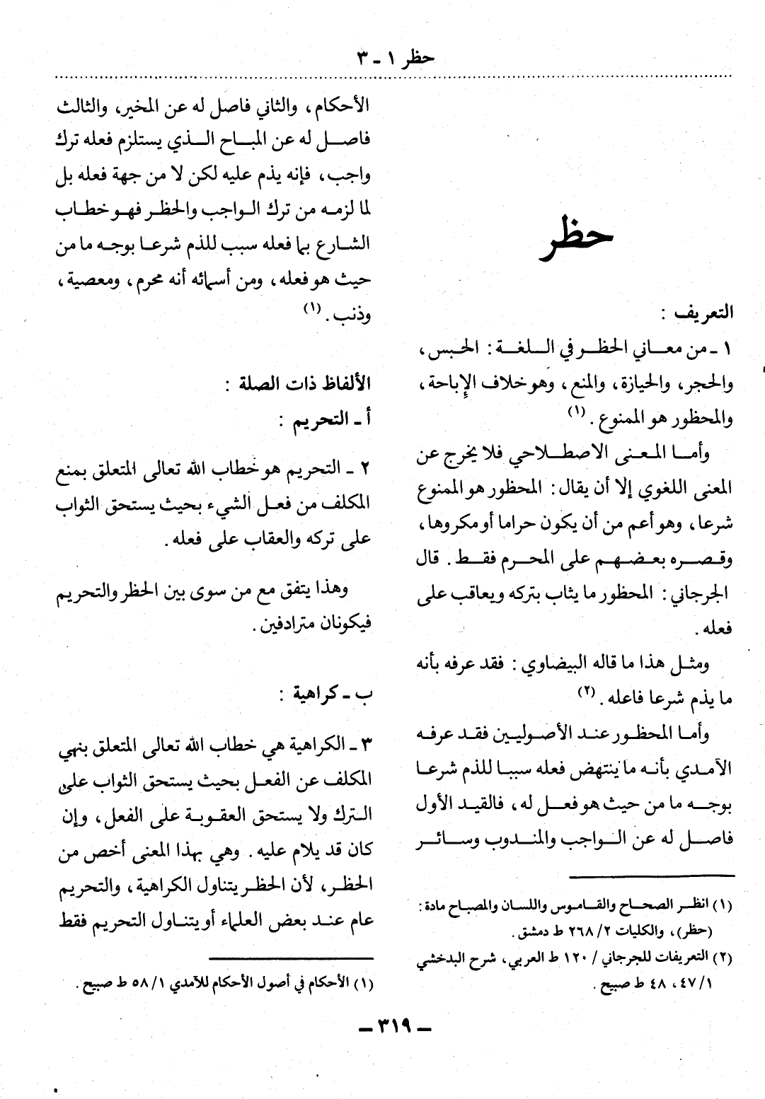 (1) انظر الصحاح والقاموس واللسان والمصباح مادة: (حظر) ، والكليات 2 / 268 ط دمشق