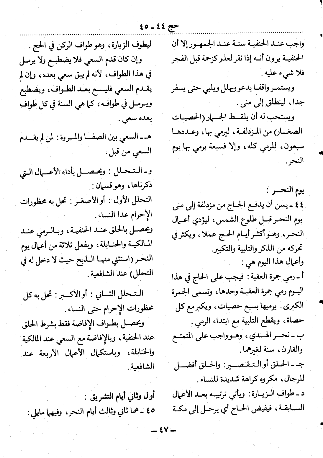 44 - يُسَنُّ أَنْ يَدْفَعَ الْحَاجُّ مِنْ مُزْدَلِفَةَ إِلَى مِنًى يَوْمَ النَّحْرِ قَبْل طُلُوعِ الشَّمْسِ، لِيُؤَدِّيَ أَعْمَال النَّحْرِ، وَهُوَ أَكْثَرُ أَيَّامِ الْحَجِّ عَمَلاً، وَيُكْثِرُ فِي تَحَرُّكِهِ مِنَ الذِّكْرِ وَالتَّلْبِيَةِ وَالتَّكْبِيرِ.