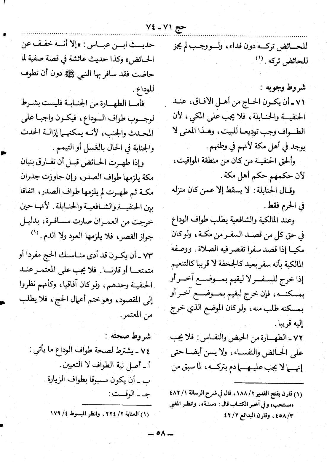 72 - الطَّهَارَةُ مِنَ الْحَيْضِ وَالنِّفَاسِ: فَلاَ يَجِبُ عَلَى الْحَائِضِ وَالنُّفَسَاءِ، وَلاَ يُسَنُّ أَيْضًا حَتَّى إِنَّهُمَا لاَ يَجِبُ عَلَيْهِمَا دَمٌ بِتَرْكِهِ، لِمَا سَبَقَ مِنْ