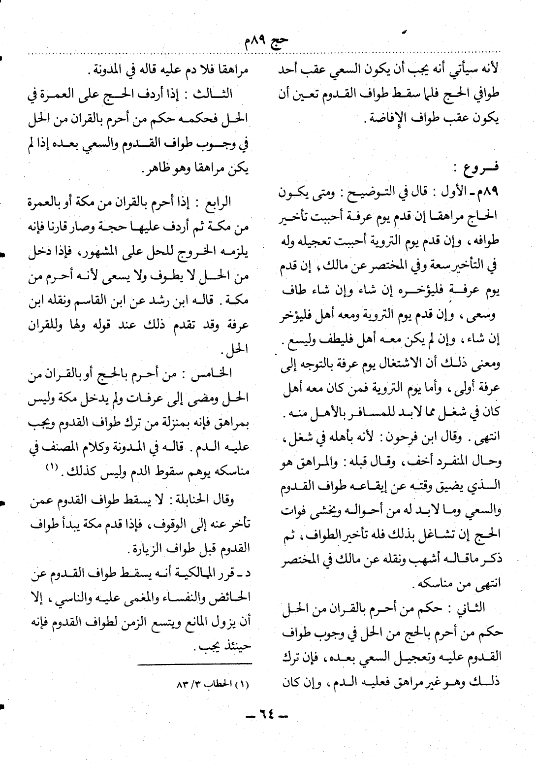 89 م - الأَْوَّل: قَال فِي التَّوْضِيحِ: وَمَتَى يَكُونُ الْحَاجُّ مُرَاهِقًا إِنْ قَدِمَ يَوْمَ عَرَفَةَ أَحْبَبْتُ تَأْخِيرَ طَوَافِهِ، وَإِنْ قَدِمَ يَوْمَ التَّرْوِيَةِ أَحْبَبْتُ تَعْجِيلَهُ وَلَهُ فِي التَّأْخِيرِ سَعَةٌ وَفِي الْمُخْتَصَرِ عَنْ مَالِكٍ، إِنْ قَدِمَ يَوْمَ عَرَفَةَ فَلْيُؤَخِّرْهُ إِنْ شَاءَ وَإِنْ شَاءَ طَافَ وَسَعَى، وَإِنْ قَدِمَ يَوْمَ التَّرْوِيَةِ وَمَعَهُ أَهْلٌ فَلْيُؤَخِّرْ إِنْ شَاءَ، وَإِنْ لَمْ يَكُنْ مَعَهُ أَهْلٌ فَلْيَطُفْ وَلْيَسْعَ. وَمَعْنَى ذَلِكَ أَنَّ الاِشْتِغَال يَوْمَ عَرَفَةَ بِالتَّوَجُّهِ إِلَى عَرَفَةَ أَوْلَى، وَأَمَّا يَوْمُ التَّرْوِيَةِ فَمَنْ كَانَ مَعَهُ أَهْلٌ كَانَ فِي شُغْلٍ مِمَّا لاَ بُدَّ لِلْمُسَافِرِ بِالأَْهْل مِنْهُ. انْتَهَى. وَقَال ابْنُ فَرْحُونَ: لأَِنَّهُ بِأَهْلِهِ فِي شُغُلٍ، وَحَال الْمُنْفَرِدِ أَخَفُّ، وَقَال قَبْلَهُ: وَالْمُرَاهِقُ هُوَ الَّذِي يَضِيقُ وَقْتُهُ عَنْ إِيقَاعِهِ طَوَافَ الْقُدُومِ وَالسَّعْيِ وَمَا لاَ بُدَّ لَهُ مِنْ أَحْوَالِهِ وَيَخْشَى فَوَاتَ الْحَجِّ إِنْ تَشَاغَل بِذَلِكَ فَلَهُ تَأْخِيرُ الطَّوَافِ، ثُمَّ ذَكَرَ مَا قَالَهُ أَشْهَبُ وَنَقَلَهُ عَنْ مَالِكٍ فِي الْمُخْتَصَرِ انْتَهَى مِنْ مَنَاسِكِهِ.