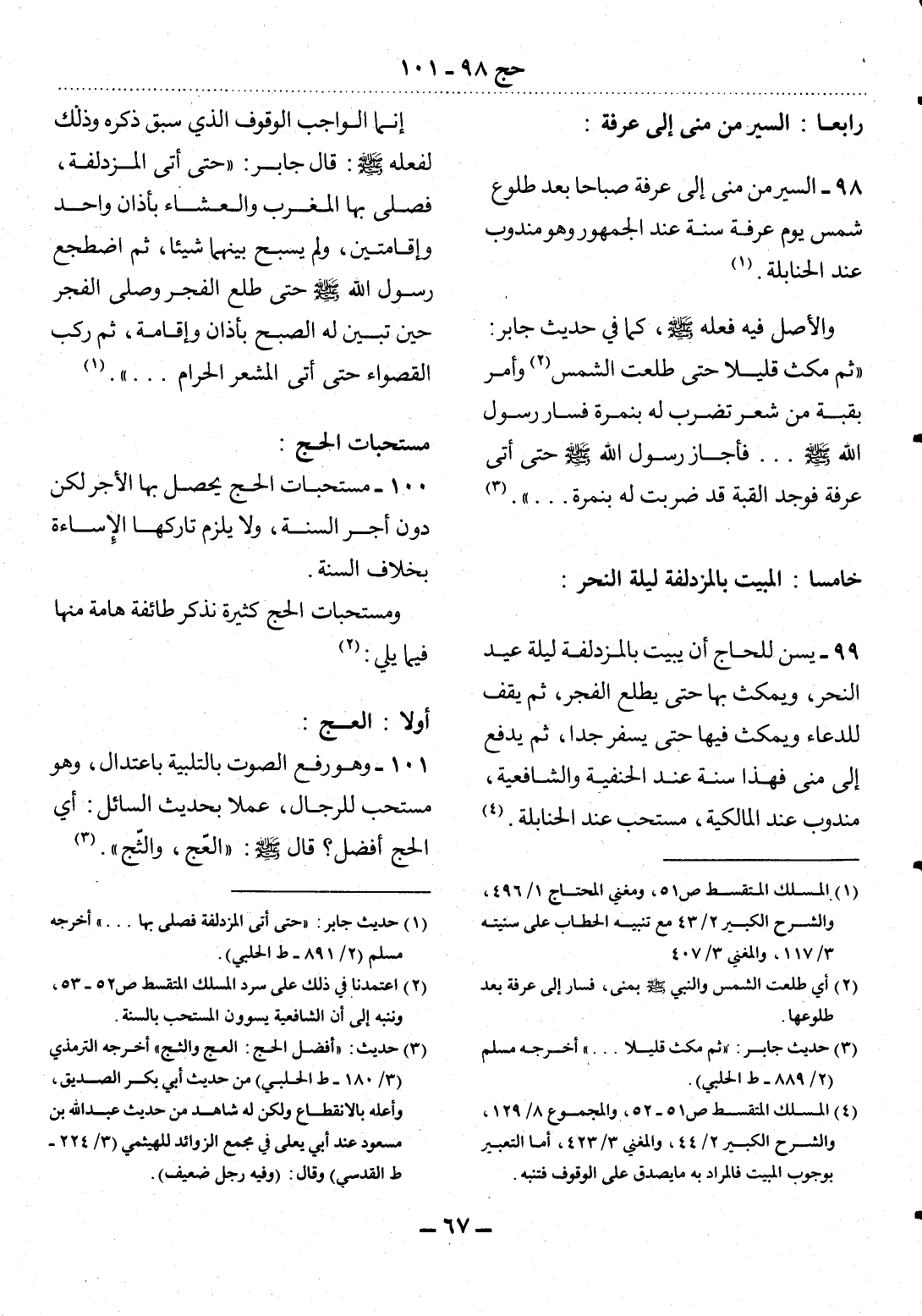 99 - يُسَنُّ لِلْحَاجِّ أَنْ يَبِيتَ بِالْمُزْدَلِفَةِ لَيْلَةَ عِيدِ النَّحْرِ، وَيَمْكُثَ بِهَا حَتَّى يَطْلُعَ الْفَجْرُ، ثُمَّ يَقِفَ لِلدُّعَاءِ وَيَمْكُثَ فِيهَا حَتَّى يُسْفِرَ جِدًّا، ثُمَّ يَدْفَعَ إِلَى مِنًى فَهَذَا سُنَّةٌ عِنْدَ الْحَنَفِيَّةِ وَالشَّافِعِيَّةِ، مَنْدُوبٌ عِنْدَ الْمَالِكِيَّةِ، مُسْتَحَبٌّ عِنْدَ الْحَنَابِلَةِ (4) .