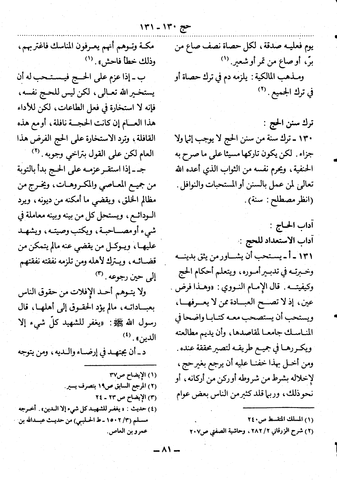 131 - أ - يُسْتَحَبُّ أَنْ يُشَاوِرَ مَنْ يَثِقُ بِدِينِهِ وَخِبْرَتِهِ فِي تَدْبِيرِ أُمُورِهِ، وَيَتَعَلَّمَ أَحْكَامَ الْحَجِّ وَكَيْفِيَّتَهُ. قَال الإِْمَامُ النَّوَوِيُّ: وَهَذَا فَرْضُ عَيْنٍ، إِذْ لاَ تَصِحُّ الْعِبَادَةُ مِمَّنْ لاَ يَعْرِفُهَا، وَيُسْتَحَبُّ أَنْ يَسْتَصْحِبَ مَعَهُ كِتَابًا وَاضِحًا فِي الْمَنَاسِكِ جَامِعًا لِمَقَاصِدِهَا، وَأَنْ يُدِيمَ مُطَالَعَتَهُ وَيُكَرِّرَهَا فِي جَمِيعِ طَرِيقِهِ لِتَصِيرَ مُحَقَّقَةً عِنْدَهُ. وَمَنْ أَخَل بِهَذَا خِفْنَا عَلَيْهِ أَنْ يَرْجِعَ بِغَيْرِ حَجٍّ، لإِِخْلاَلِهِ بِشَرْطٍ مِنْ شُرُوطِهِ أَوْ رُكْنٍ مِنْ أَرْكَانِهِ، أَوْ نَحْوِ ذَلِكَ، وَرُبَّمَا قَلَّدَ كَثِيرٌ مِنَ النَّاسِ بَعْضَ عَوَامِّ