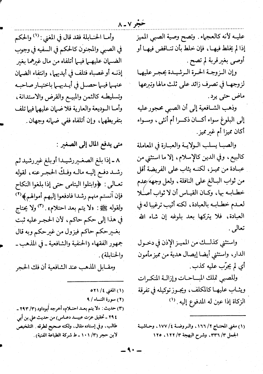 8 - إِذَا بَلَغَ الصَّغِيرُ رَشِيدًا أَوْ بَلَغَ غَيْرَ رَشِيدٍ ثُمَّ رَشَدَ دُفِعَ إِلَيْهِ مَالُهُ وَفُكَّ الْحَجْرُ عَنْهُ، لِقَوْلِهِ تَعَالَى: {وَابْتَلُوا الْيَتَامَى حَتَّى إِذَا بَلَغُوا النِّكَاحَ فَإِنْ آنَسْتُمْ مِنْهُمْ رُشْدًا فَادْفَعُوا إِلَيْهِمْ أَمْوَالَهُمْ (2) } وَلِقَوْلِهِ صَلَّى اللَّهُ عَلَيْهِ وَسَلَّمَ: لاَ يُتْمَ بَعْدَ احْتِلاَمٍ (3) . وَلاَ يُحْتَاجُ فِي هَذَا إِلَى حُكْمِ حَاكِمٍ، لأَِنَّ الْحَجْرَ عَلَيْهِ ثَبَتَ بِغَيْرِ حُكْمِ حَاكِمٍ فَيَزُول مِنْ غَيْرِ حُكْمٍ وَبِهِ قَال جُمْهُورُ الْفُقَهَاءِ (الْحَنَفِيَّةُ وَالشَّافِعِيَّةُ - فِي الْمَذْهَبِ - وَالْحَنَابِلَةُ) .