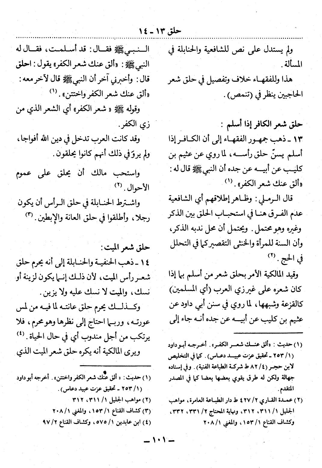 13 - ذَهَبَ جُمْهُورُ الْفُقَهَاءِ إِلَى أَنَّ الْكَافِرَ إِذَا أَسْلَمَ يُسَنُّ حَلْقُ رَأْسِهِ، لِمَا رُوِيَ عَنْ عُثَيْمِ بْنِ كُلَيْبٍ عَنْ أَبِيهِ عَنْ جَدِّهِ أَنَّ النَّبِيَّ صَلَّى اللَّهُ عَلَيْهِ وَسَلَّمَ قَال لَهُ: أَلْقِ عَنْكَ شَعْرَ الْكُفْرِ (1) .