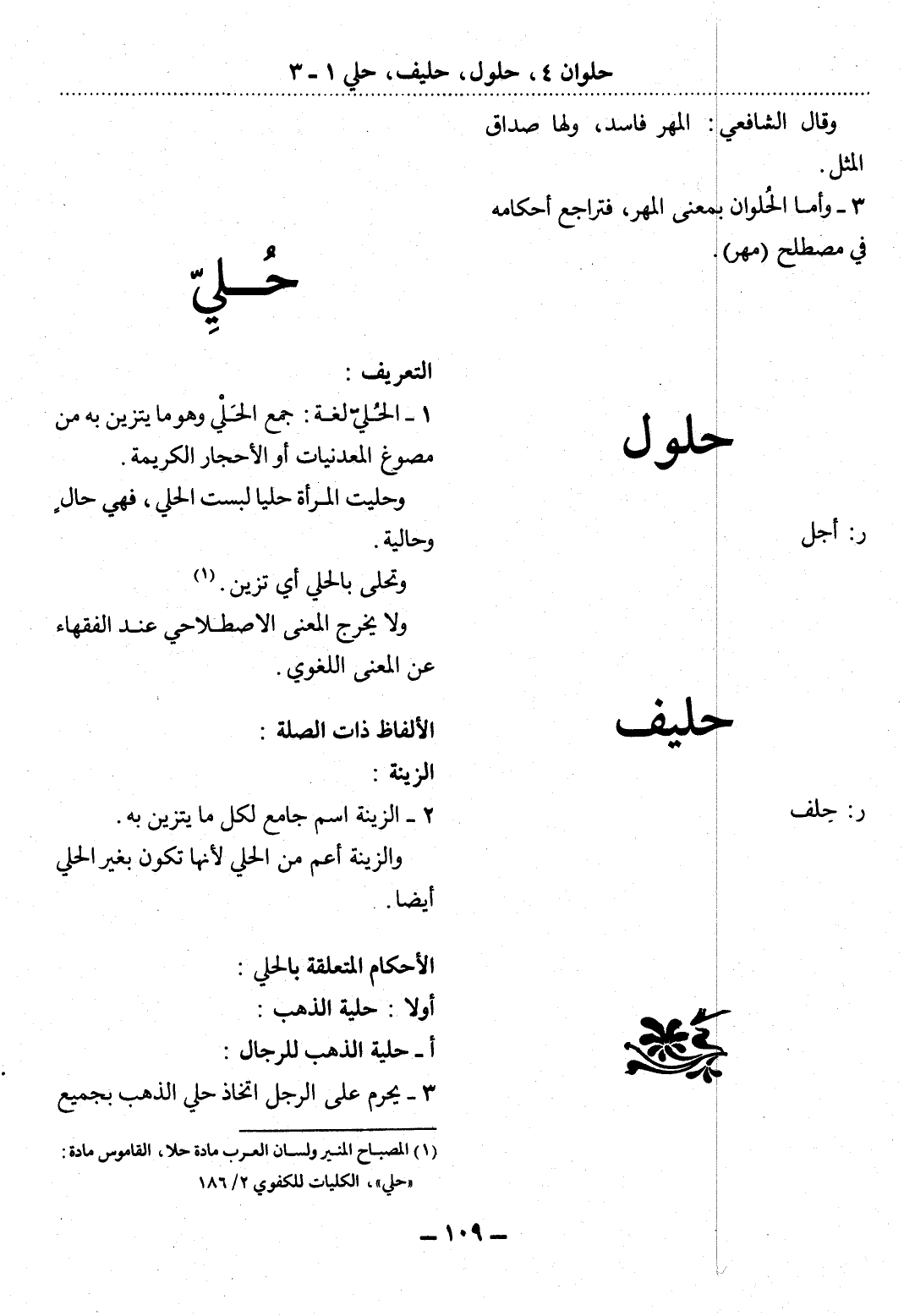 (1) المصباح المنير ولسان العرب مادة حلا، القاموس مادة: " حلي "، الكليات للكفوي 2 / 186.