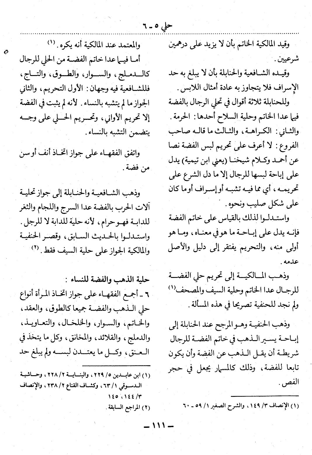 وَذَهَبَ الْمَالِكِيَّةُ إِلَى تَحْرِيمِ حُلِيِّ الْفِضَّةِ لِلرِّجَال عَدَا الْخَاتَمَ وَحِلْيَةَ السَّيْفِ وَالْمُصْحَفِ (1) وَلَمْ نَجِدْ لِلْحَنَفِيَّةِ تَصْرِيحًا فِي هَذِهِ الْمَسْأَلَةِ.