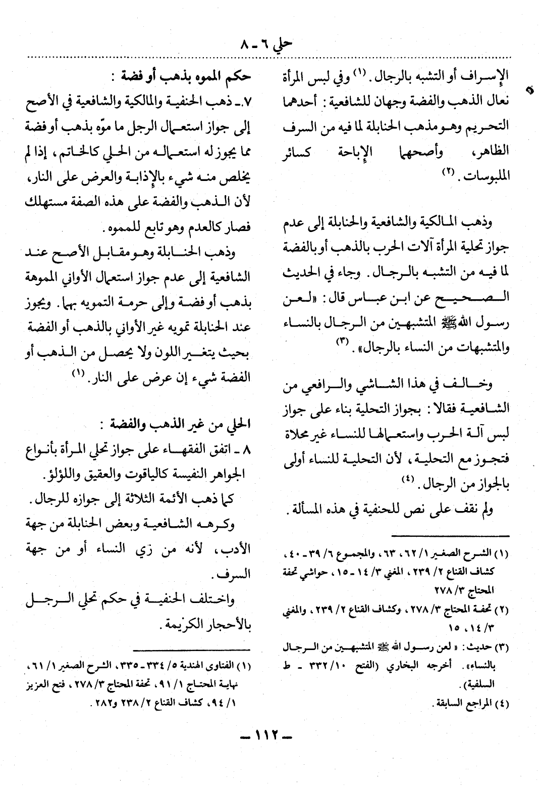 وَذَهَبَ الْمَالِكِيَّةُ وَالشَّافِعِيَّةُ وَالْحَنَابِلَةُ إِلَى عَدَمِ جَوَازِ تَحْلِيَةِ الْمَرْأَةِ آلاَتِ الْحَرْبِ بِالذَّهَبِ أَوْ بِالْفِضَّةِ لِمَا فِيهِ مِنَ التَّشَبُّهِ بِالرِّجَال. وَجَاءَ فِي الْحَدِيثِ الصَّحِيحِ عَنِ ابْنِ عَبَّاسٍ قَال: لَعَنَ رَسُول اللَّهِ صَلَّى اللَّهُ عَلَيْهِ وَسَلَّمَ الْمُتَشَبِّهِينَ مِنَ الرِّجَال بِالنِّسَاءِ، وَالْمُتَشَبِّهَاتِ مِنَ النِّسَاءِ بِالرِّجَال (3) .