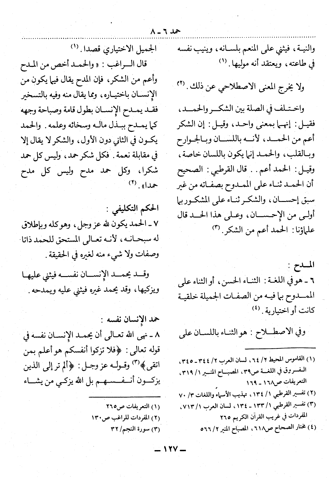 6 - هُوَ فِي اللُّغَةِ: الثَّنَاءُ الْحَسَنُ، أَوِ الثَّنَاءُ عَلَى الْمَمْدُوحِ بِمَا فِيهِ مِنَ الصِّفَاتِ الْجَمِيلَةِ خِلْقِيَّةً كَانَتْ أَوِ اخْتِيَارِيَّةً (4) .